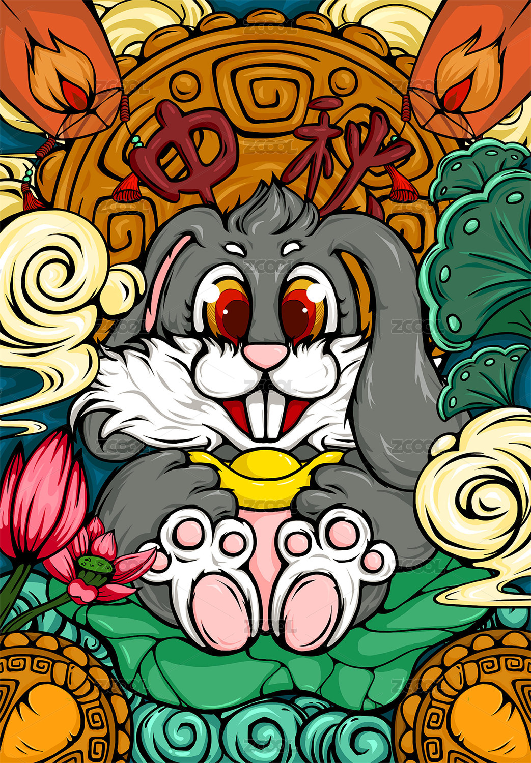 国朝矢量插画 抱着金元宝坐在荷花上的兔子