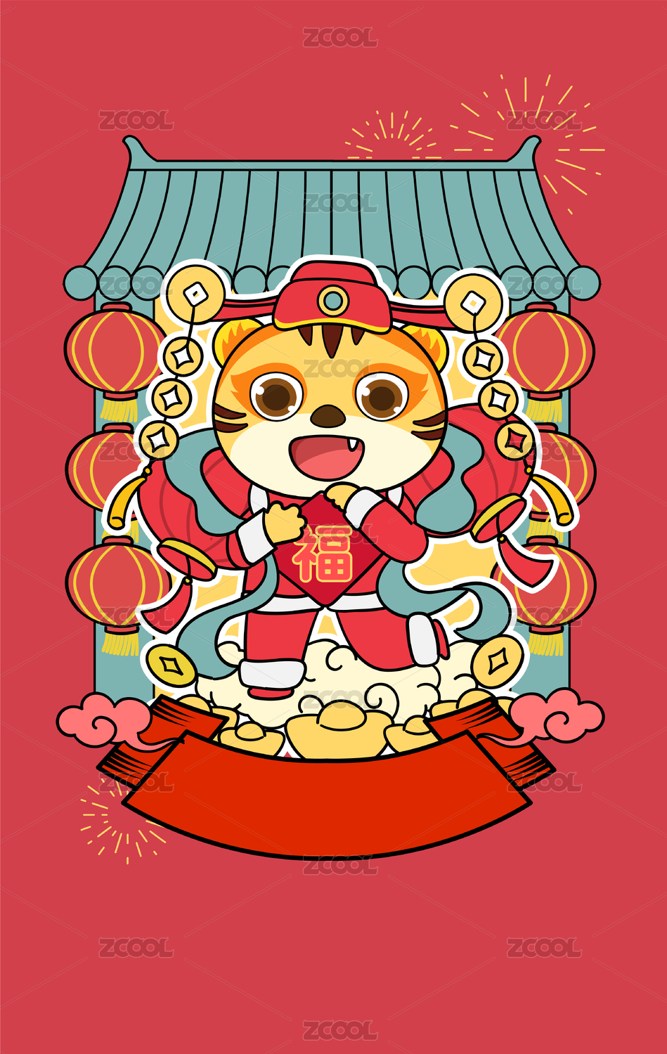 国潮老虎调皮玩手机海报