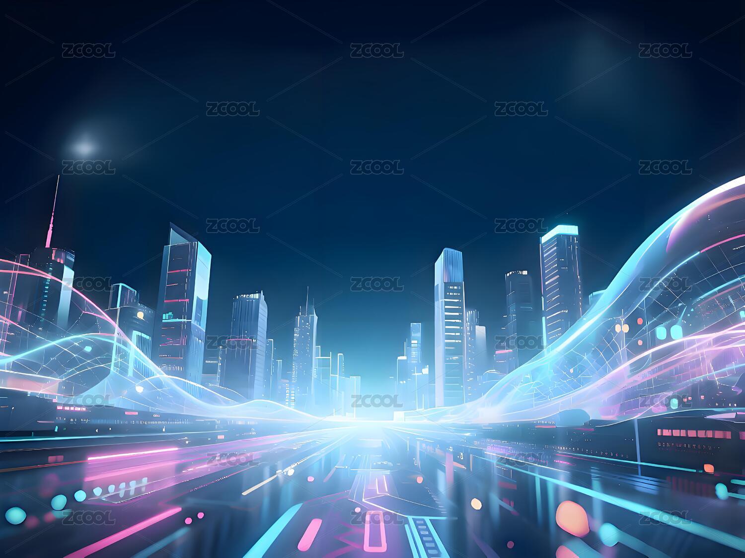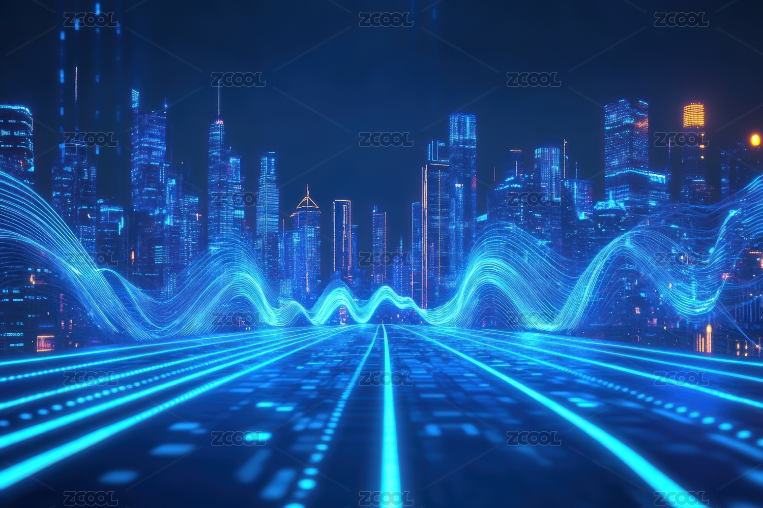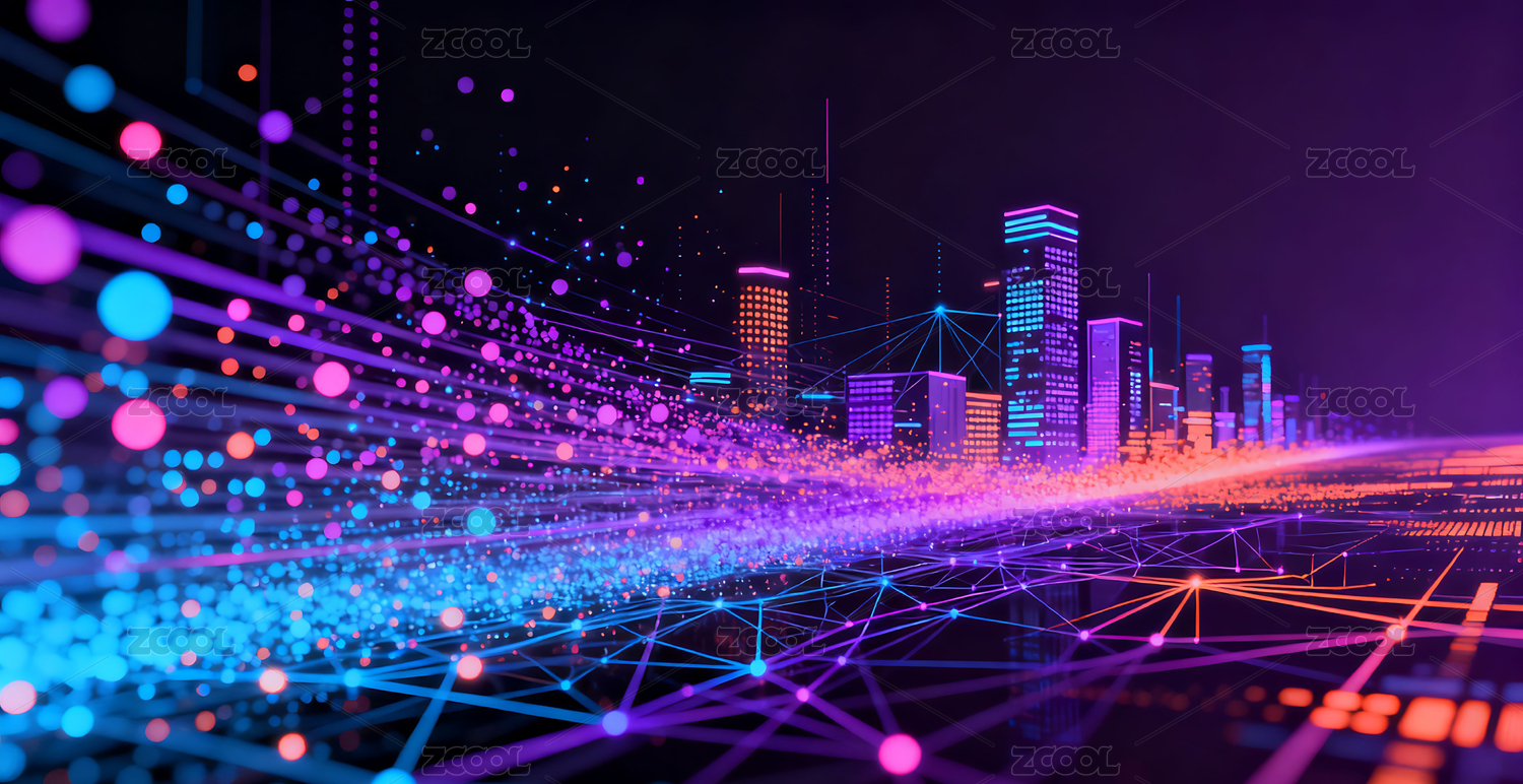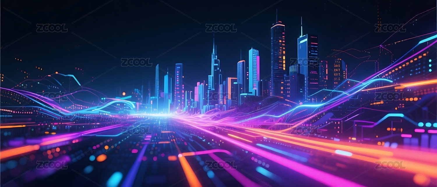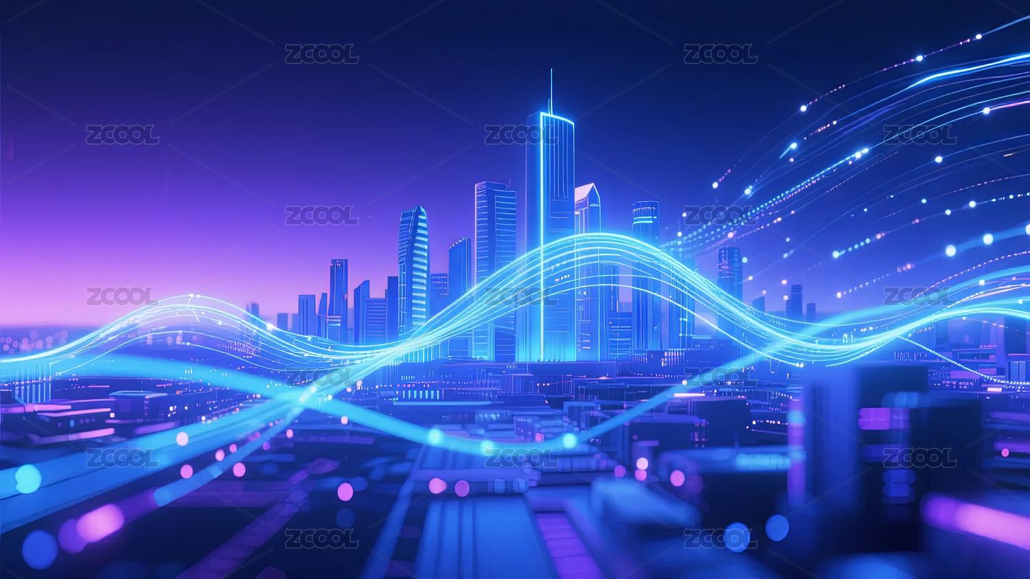抽象数据流线条发光未来城市轮廓蓝紫色渐变