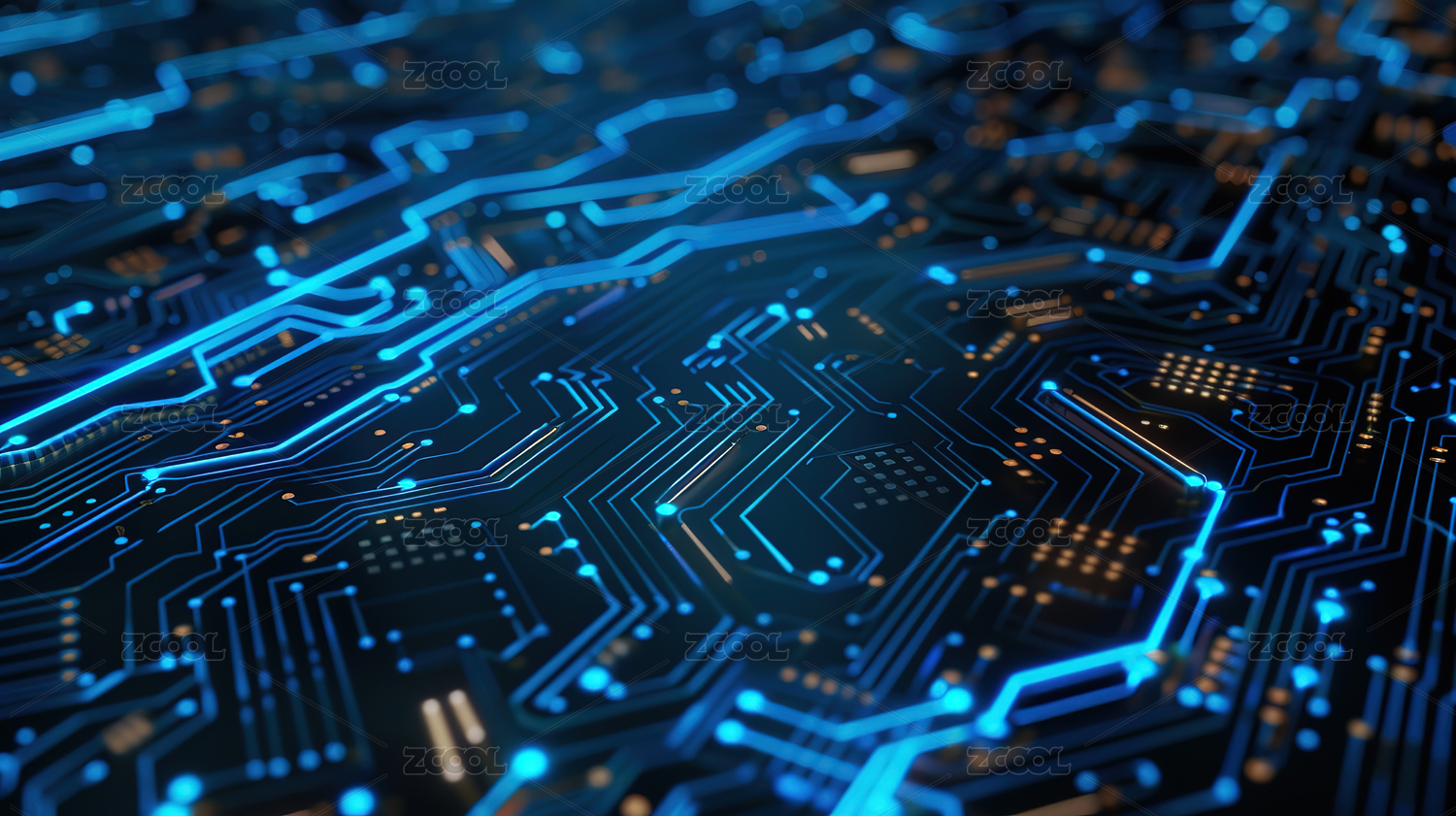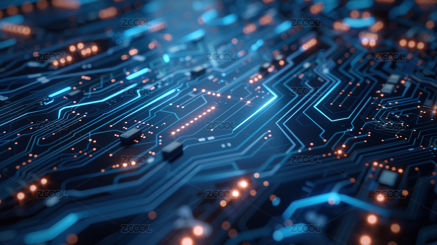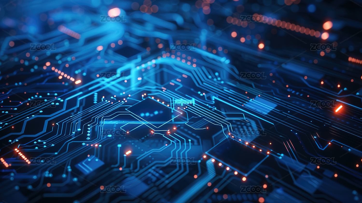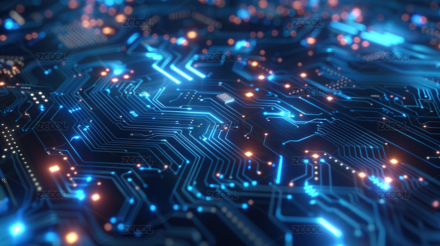 电子电路板特写电脑芯片,蓝色赛博电路未来