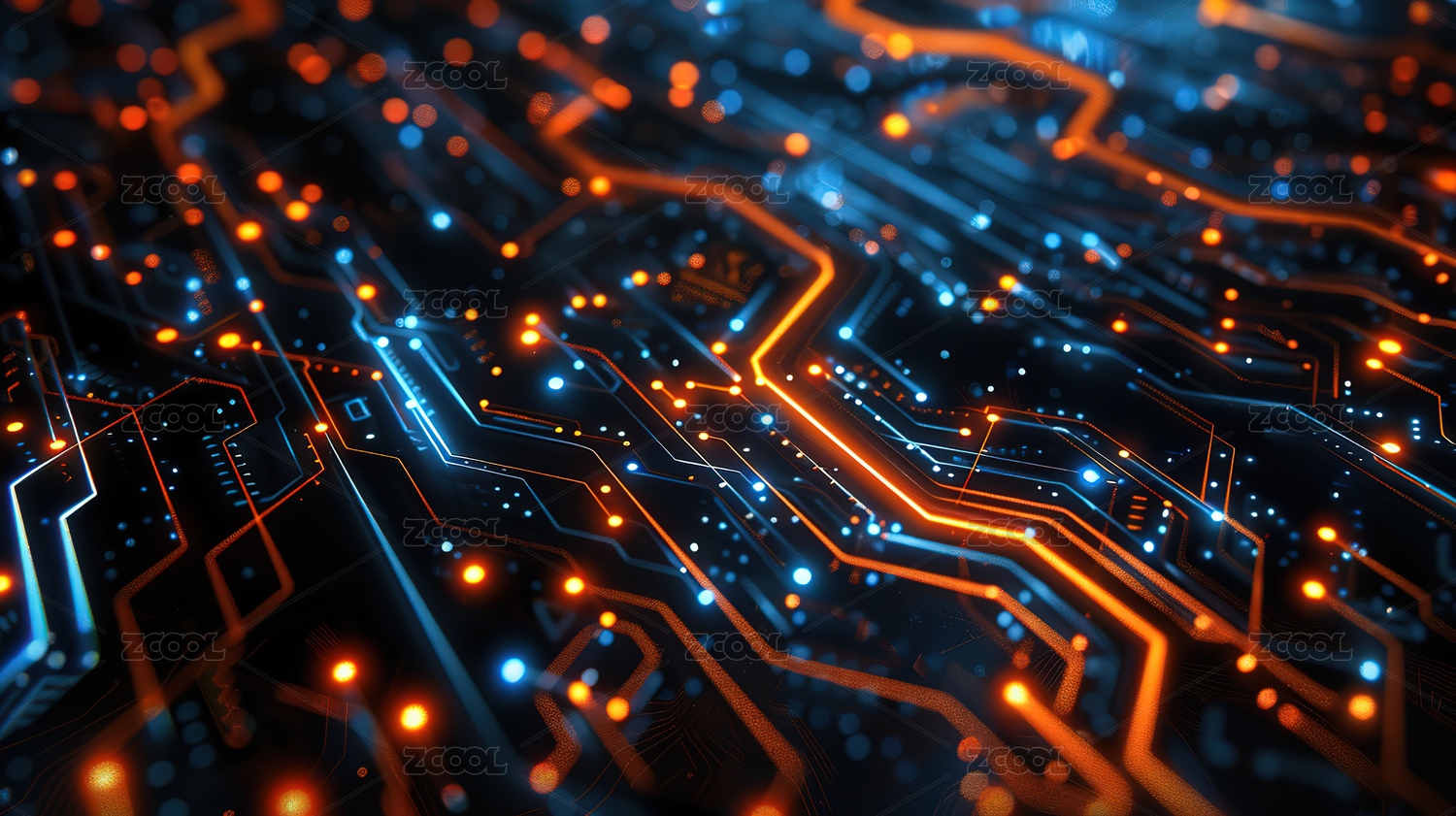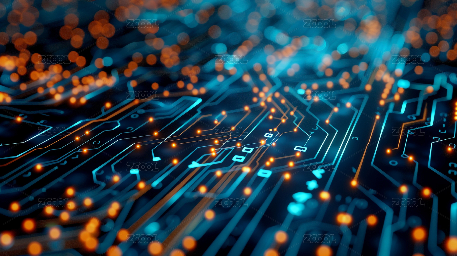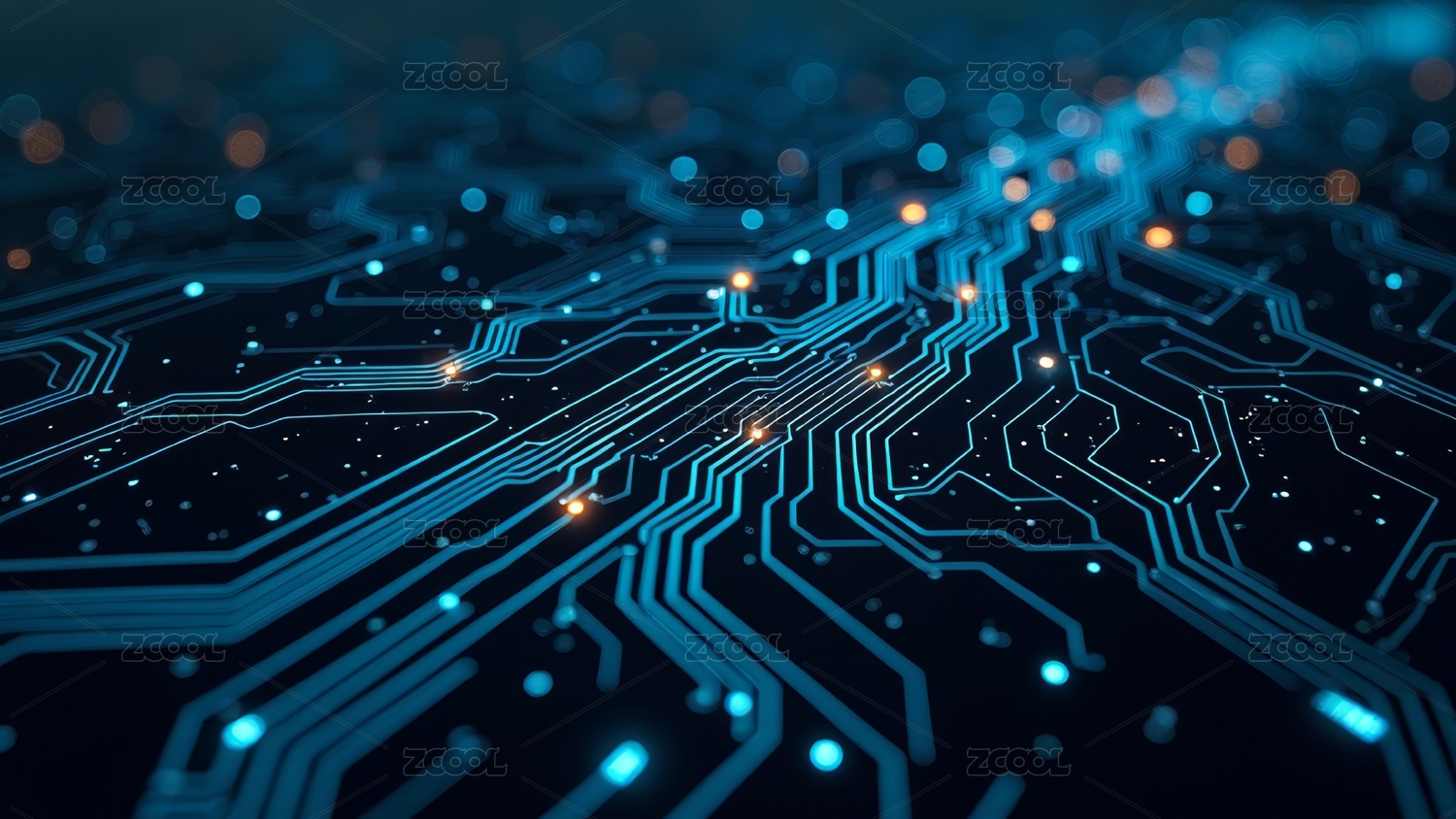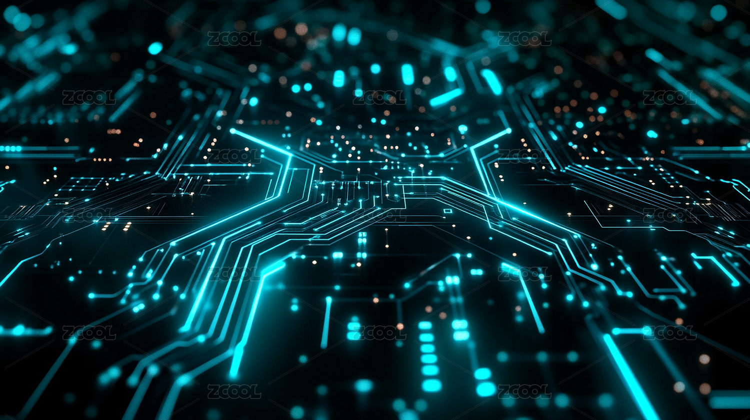 电子电路板特写电脑芯片,蓝色赛博电路未来