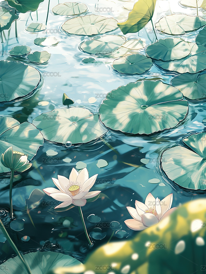 夏天清新的荷塘与荷花,日本浮世绘艺术