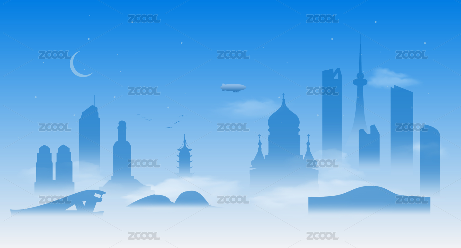 义乌城市建筑蓝色夜景手绘插画