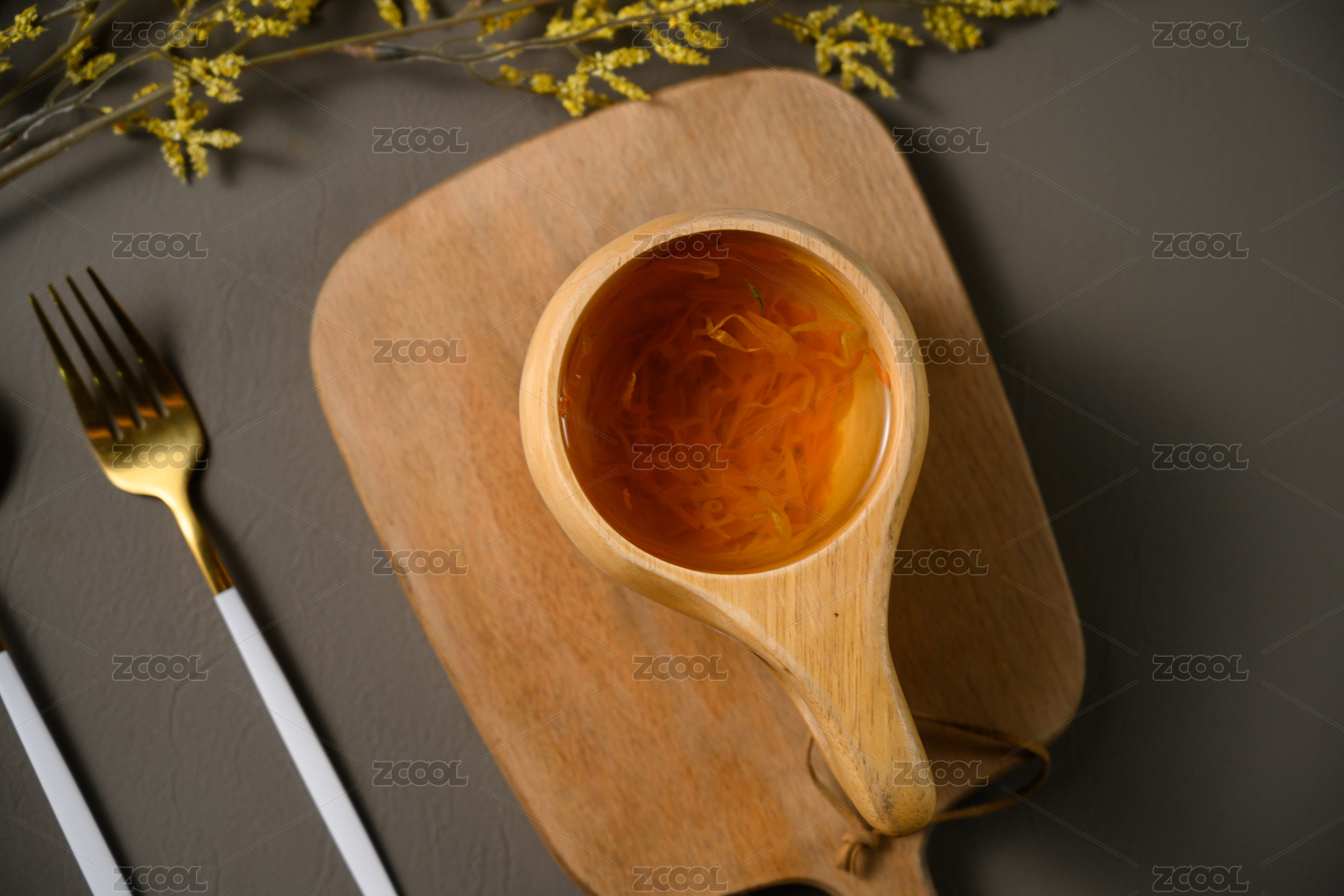 桌面上的杯子里的甘甜可口的金盏菊花茶