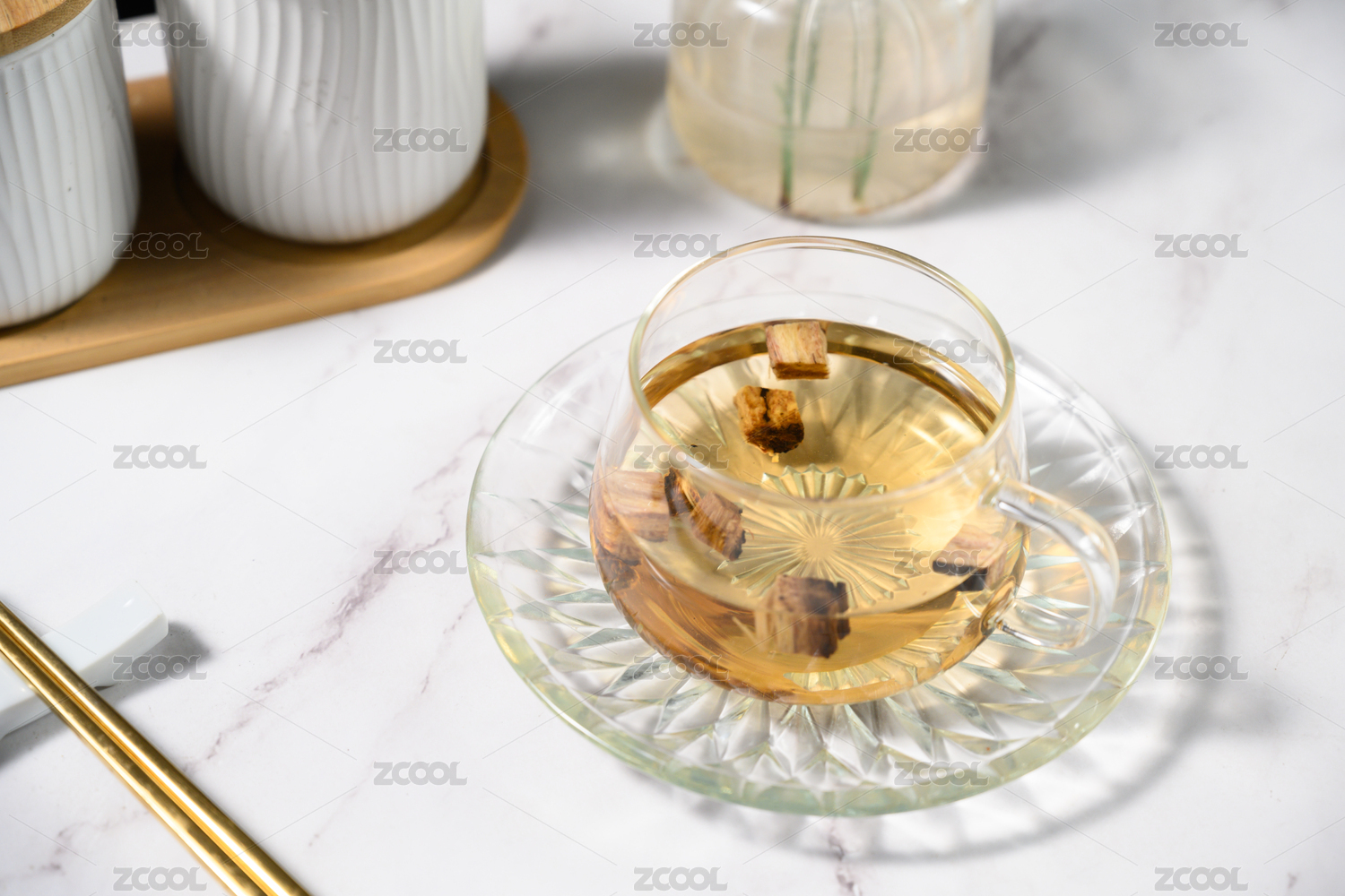 桌面上的杯子里的甘甜可口的赶黄草茶