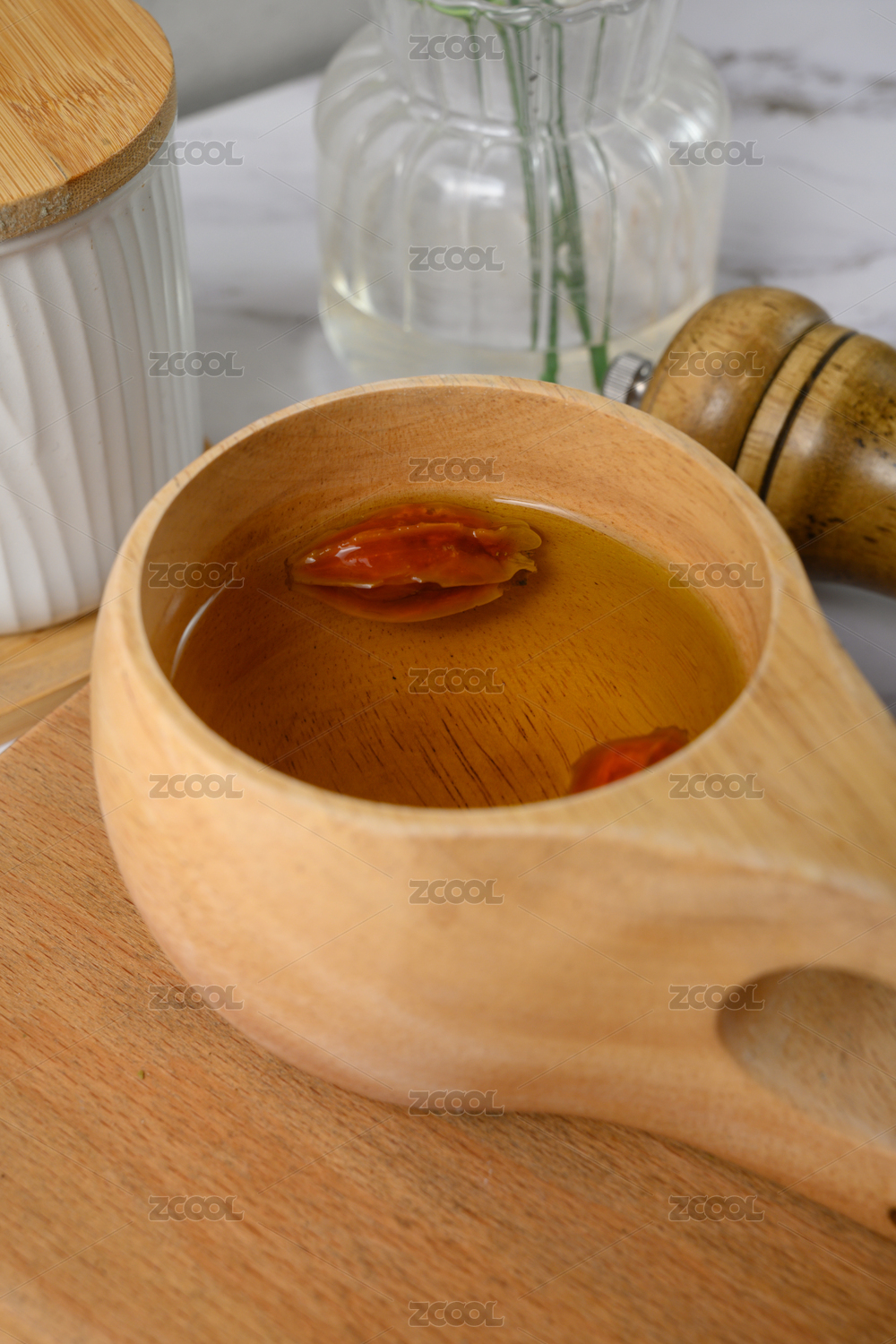 桌面上的杯子里的甘甜可口的山茱萸茶