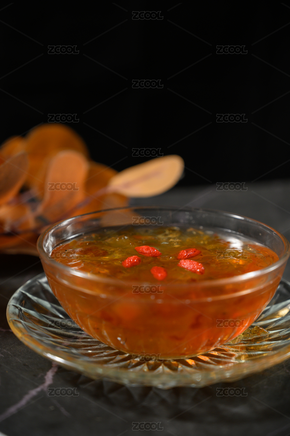 桌面上的盘子里的美味可口的冰糖炖桃胶