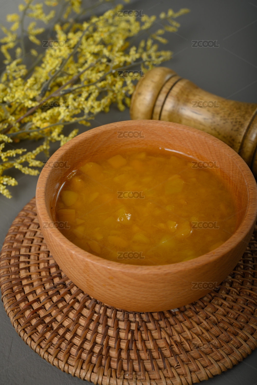 桌面上的碗里的美味可口的芒果凉粉