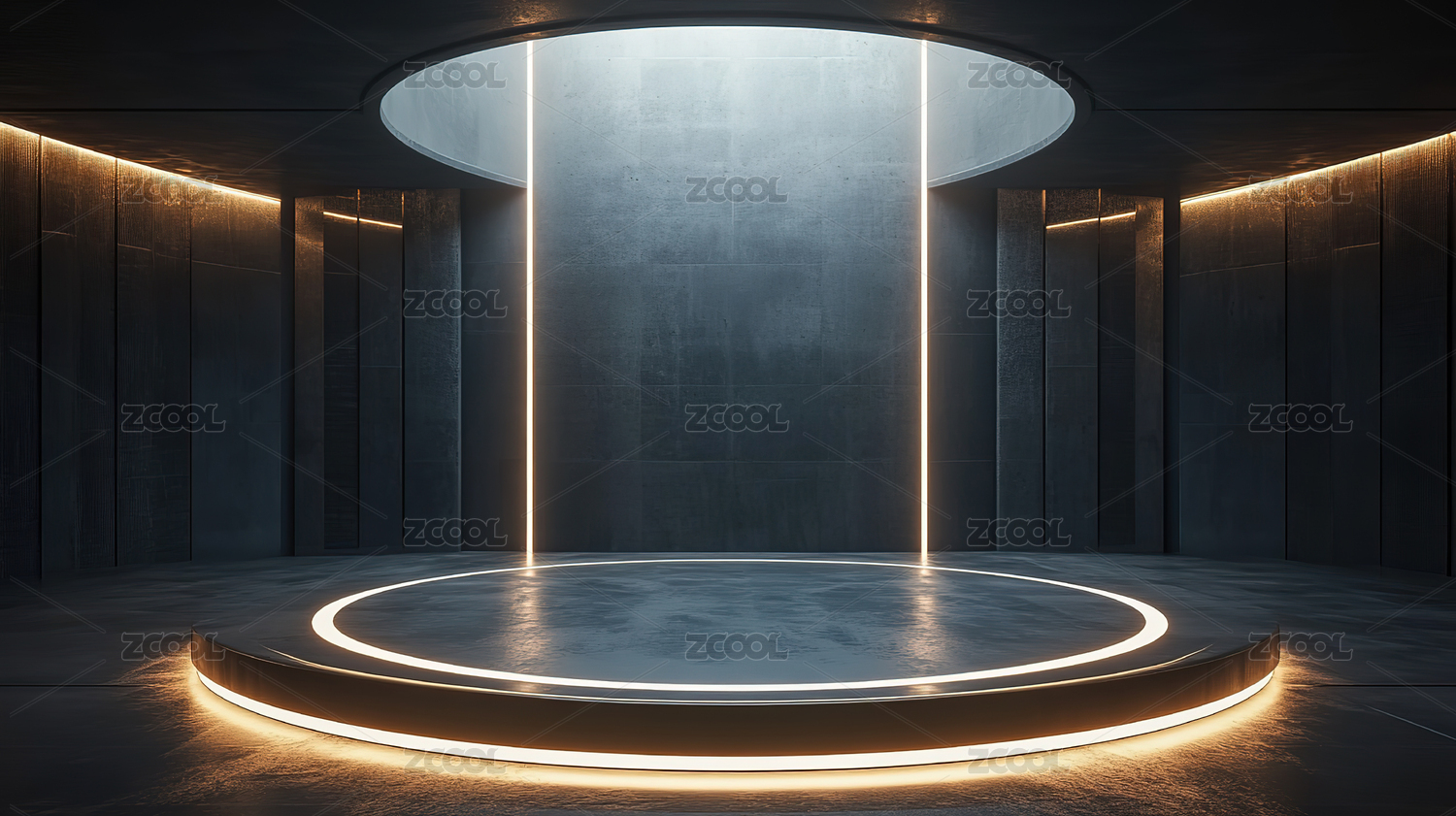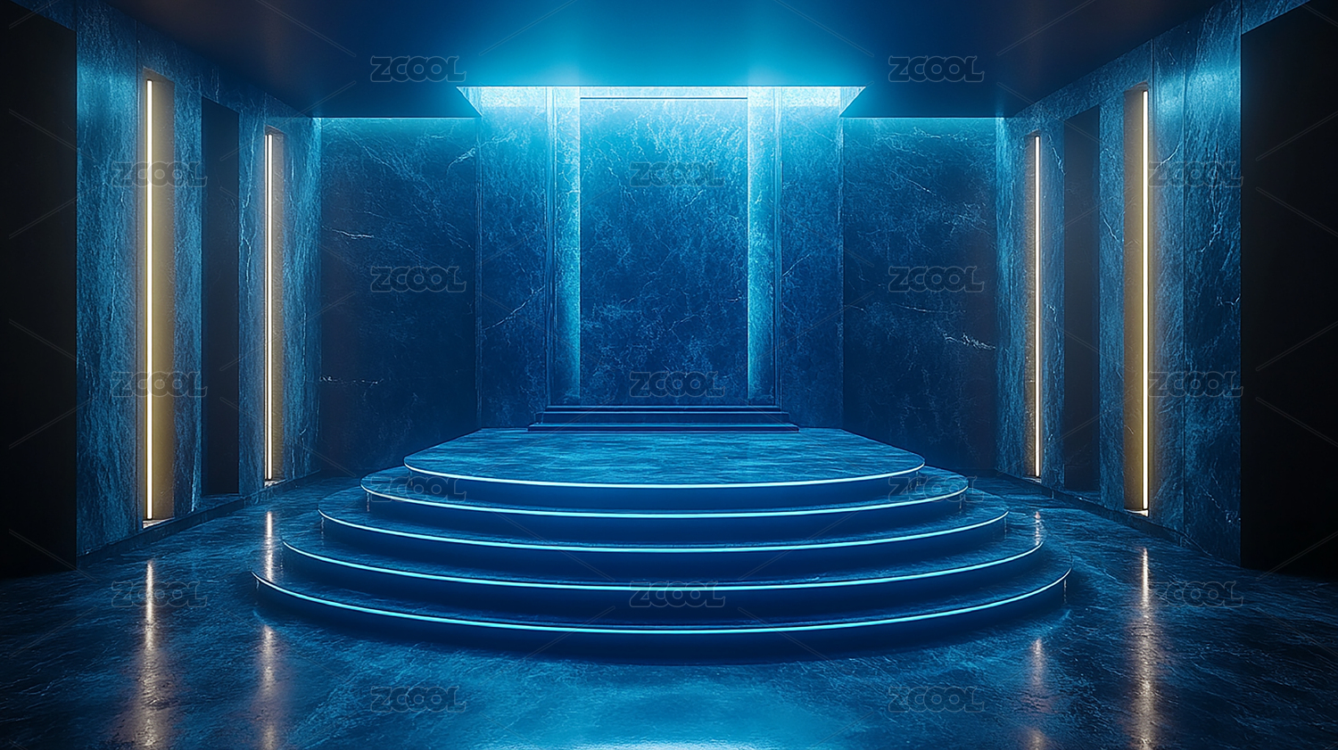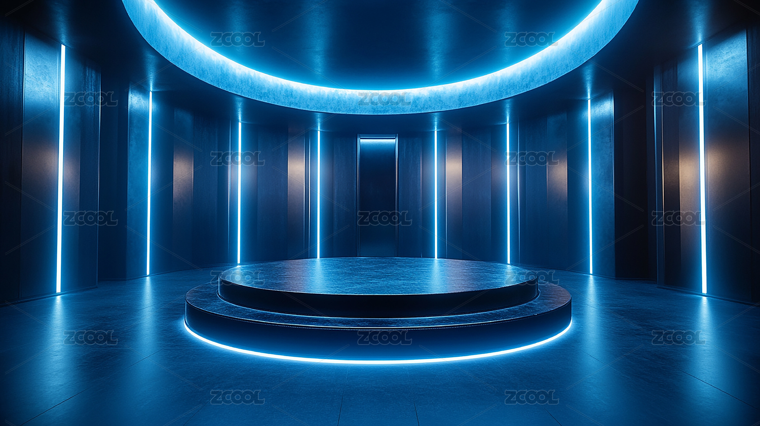 炫酷的蓝色霓虹灯照亮了科幻风格的圆形舞台