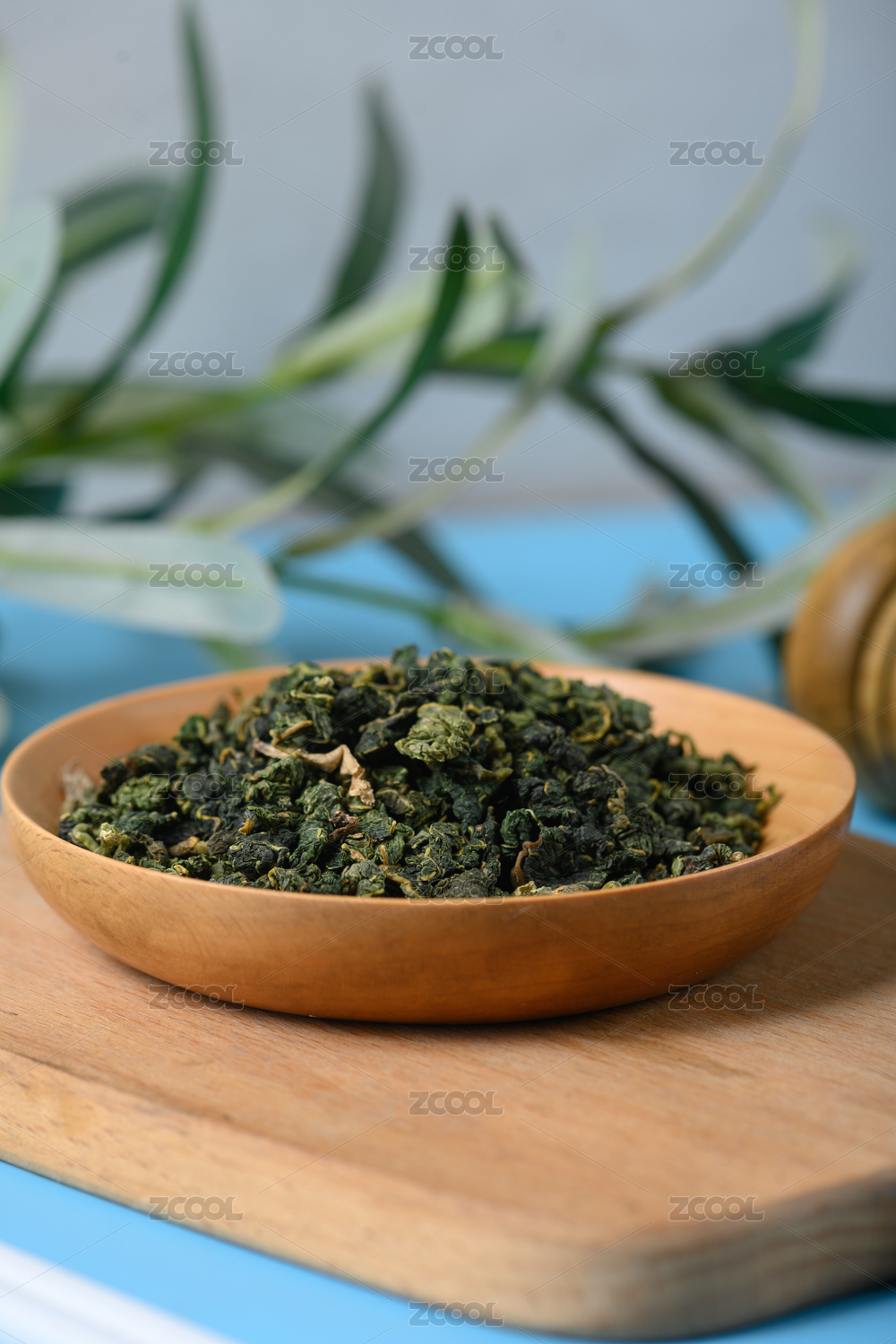 桌面上的盘子里的干爽清香的高山绿茶
