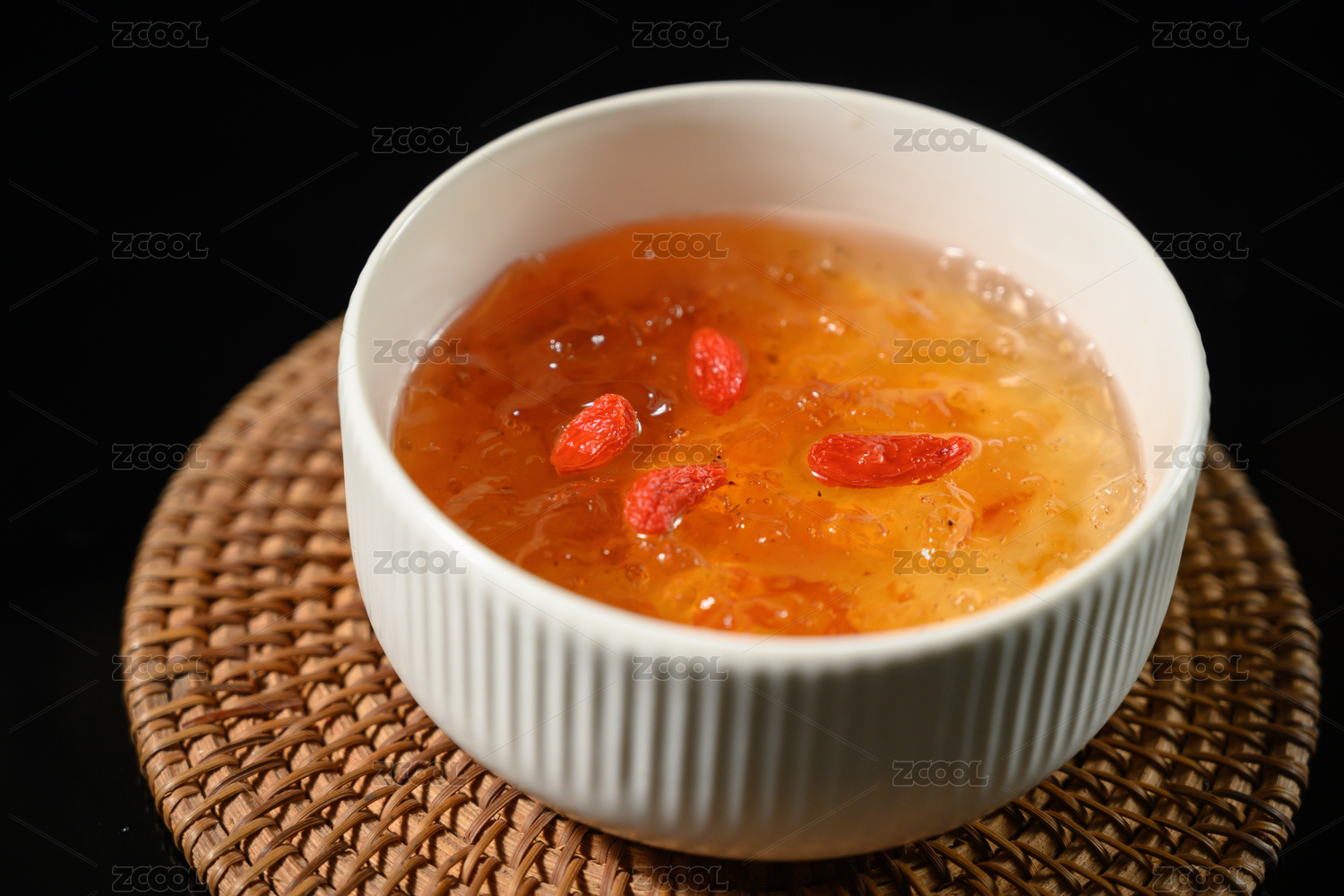 桌面上的盘子里的美味可口的冰糖炖桃胶
