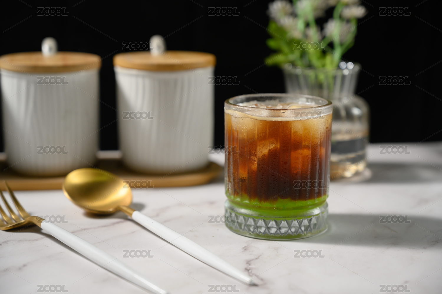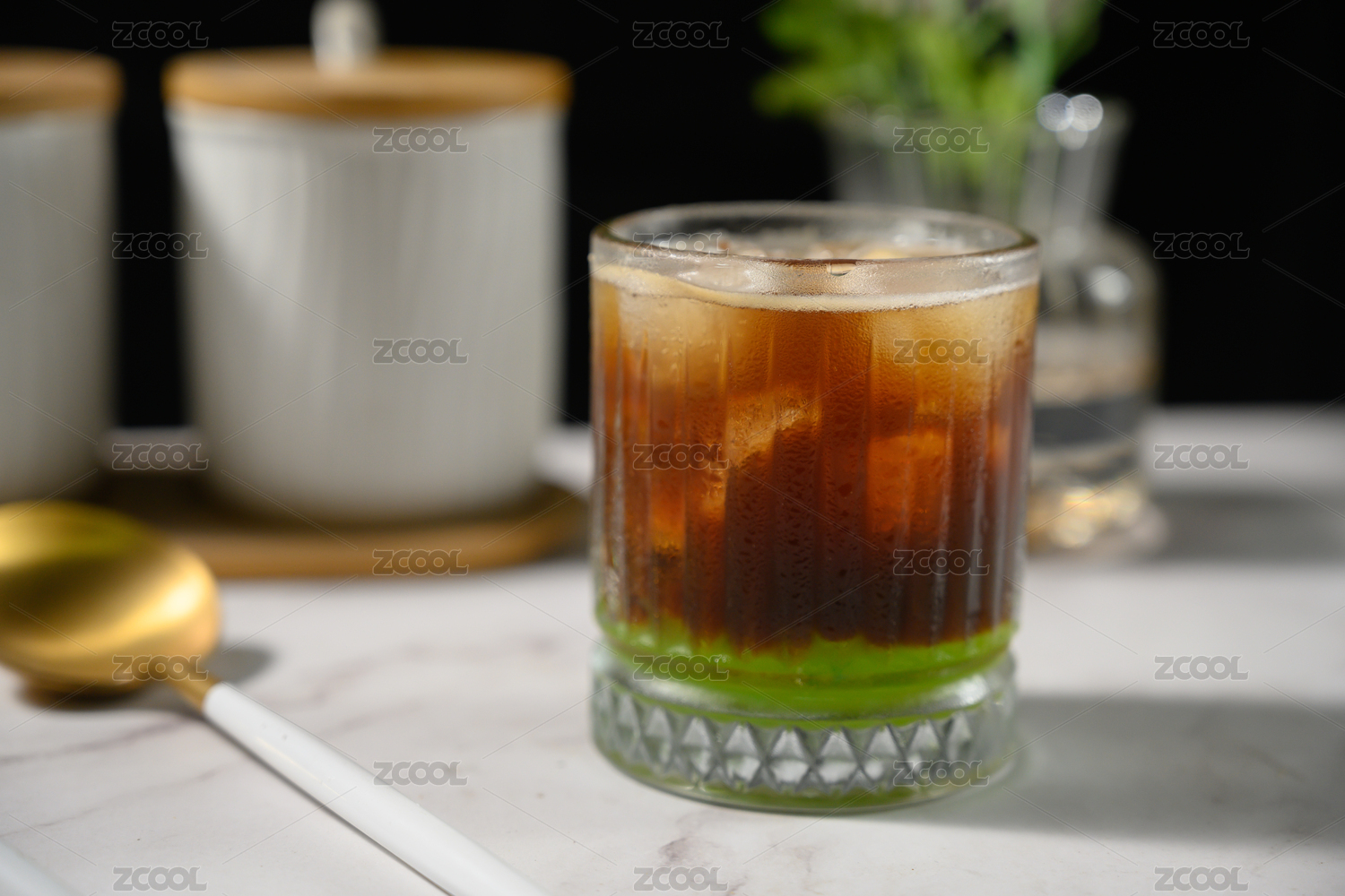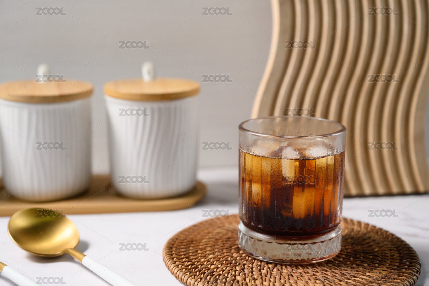 桌面上的杯子里美味香气四溢的冰美式咖啡