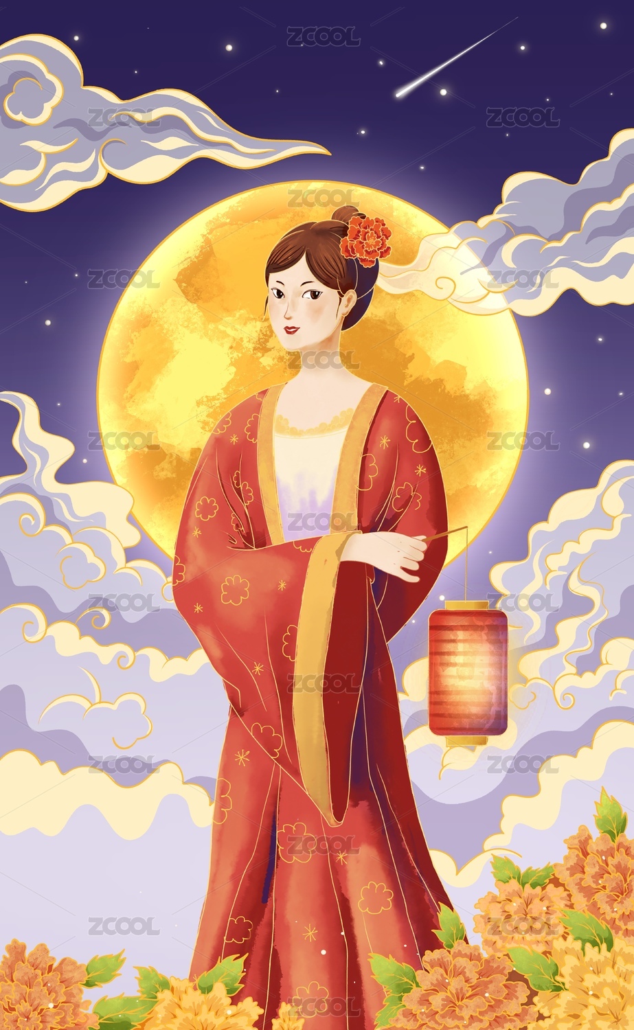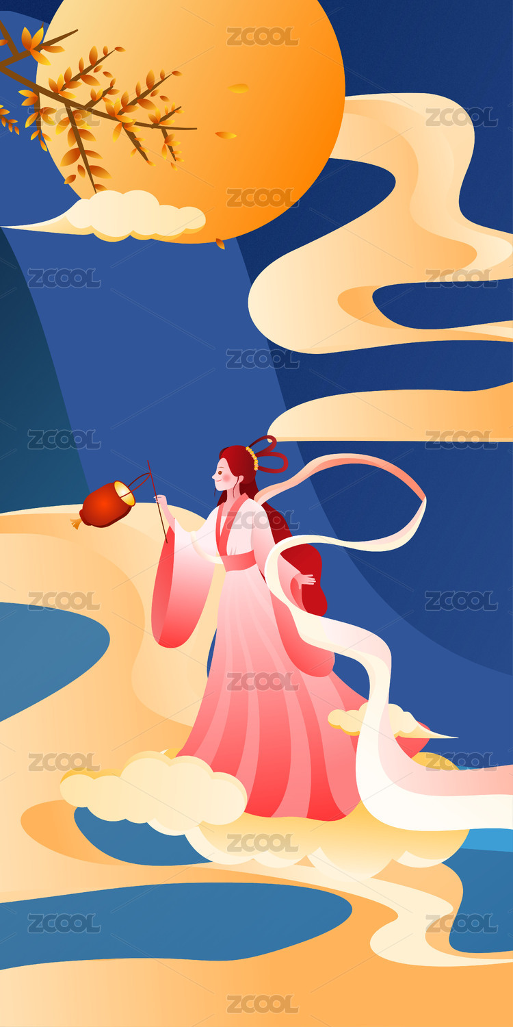 中国传统节日中秋节嫦娥奔月手绘插画竖版