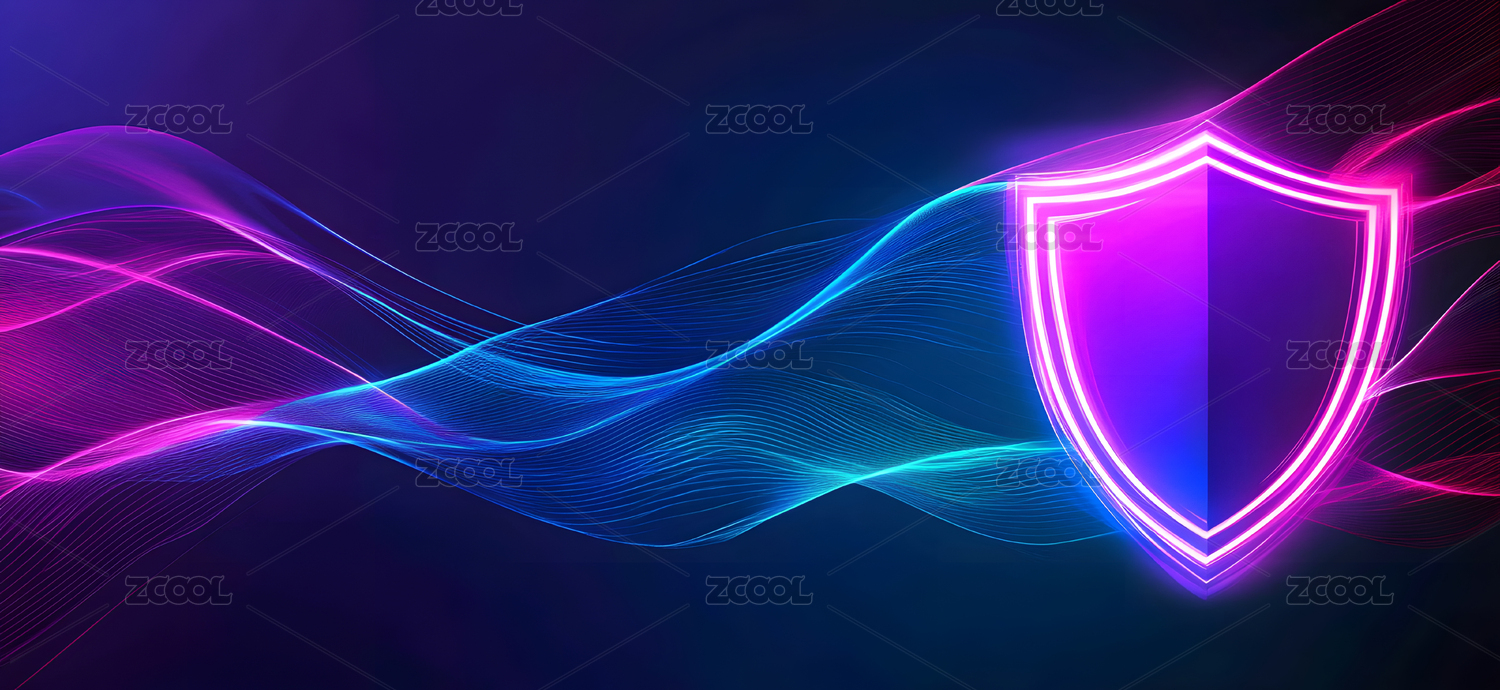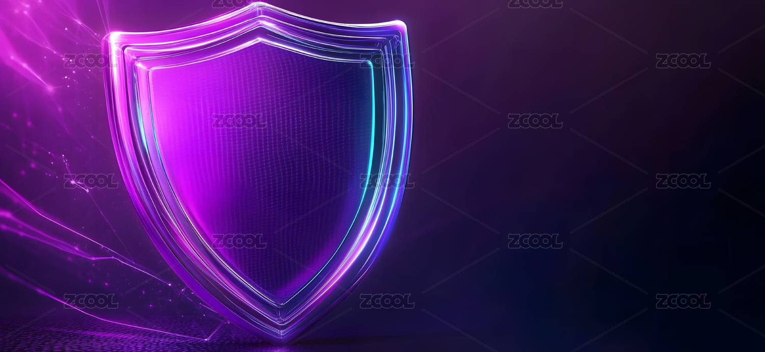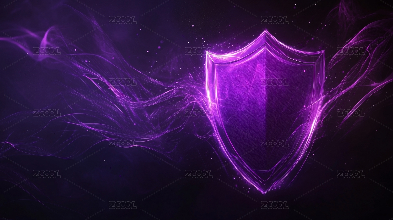 一个紫色的盾牌图标在抽象背景上散发着能量