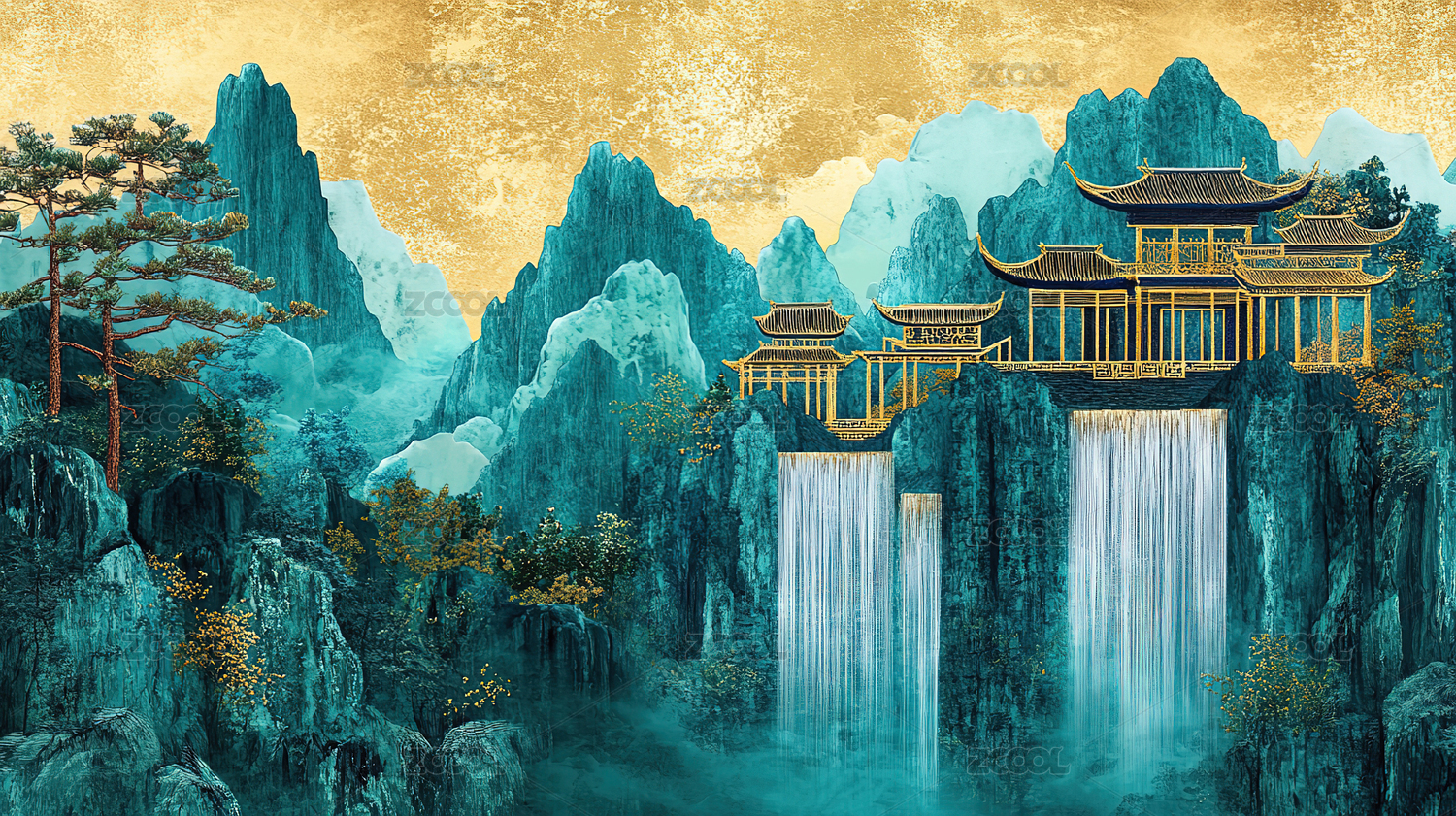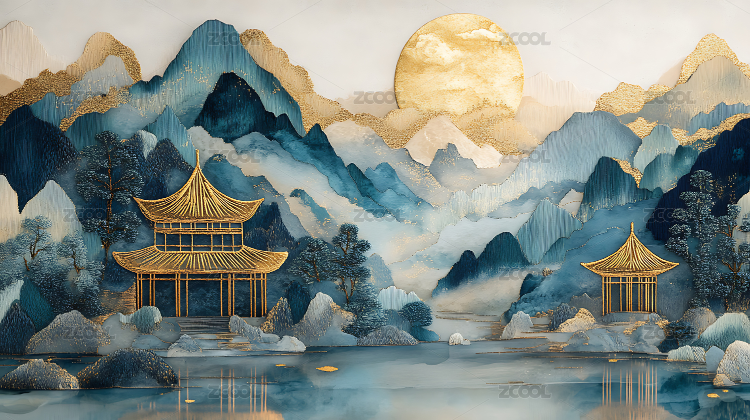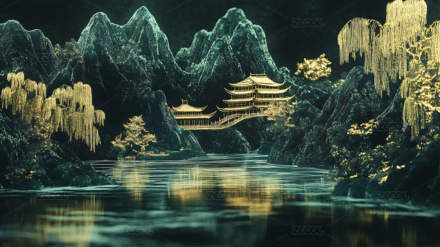 中式,建筑,宫殿,金色,海洋,山脉,树木,风景,水彩,艺术