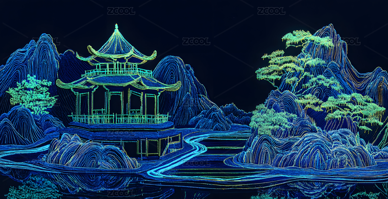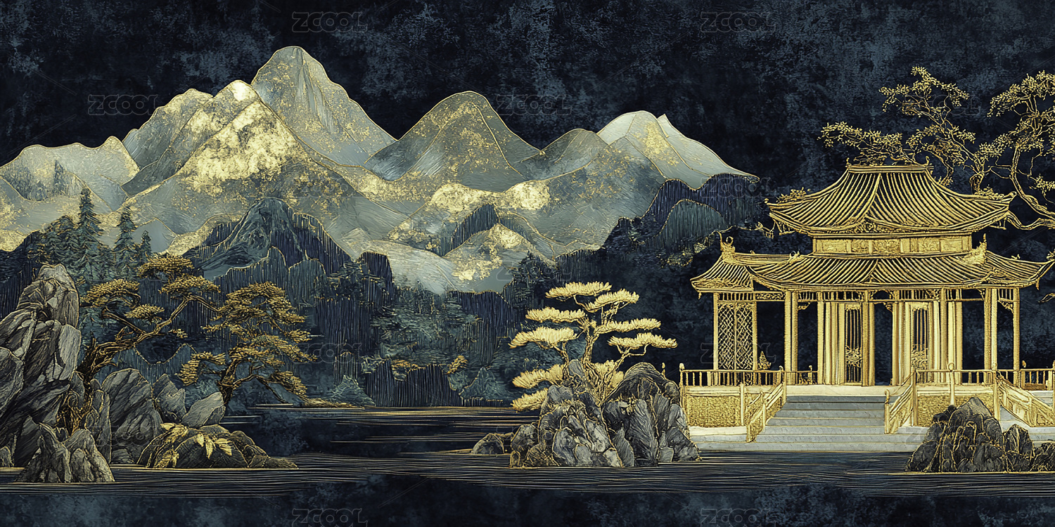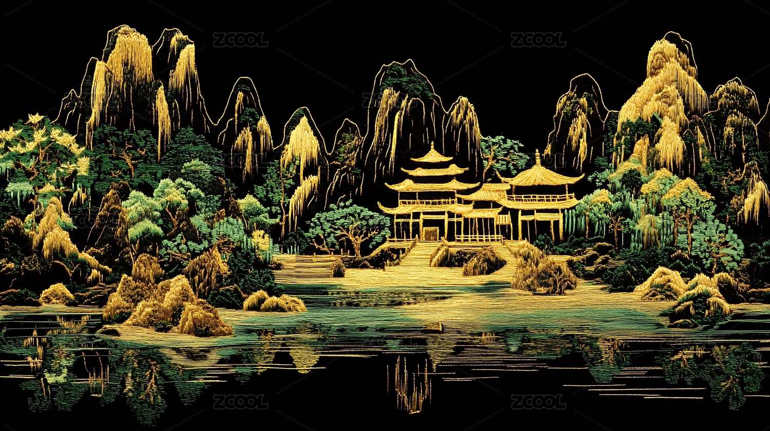 中式,建筑,宫殿,金色,海洋,山脉,树木,风景,水彩,艺术