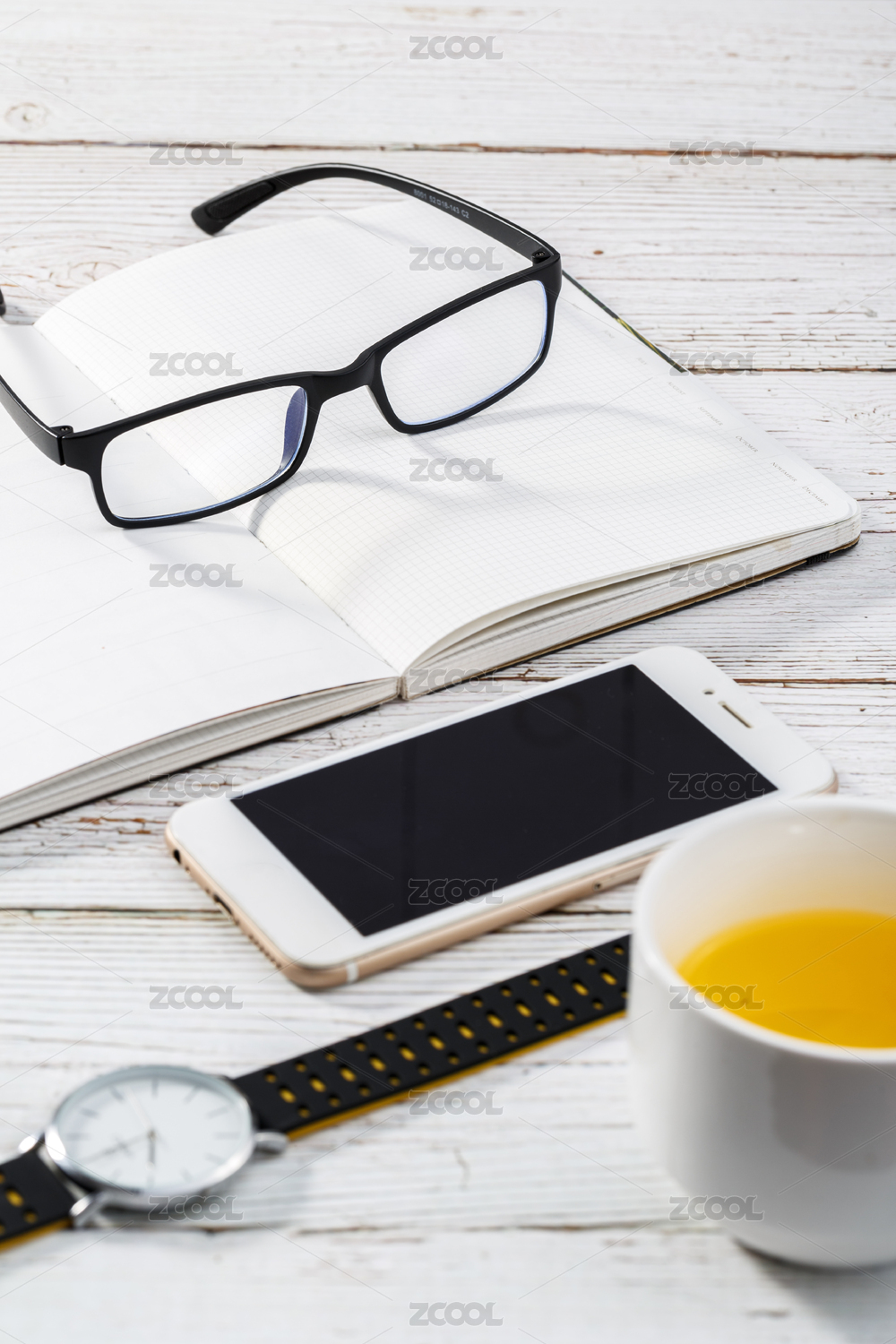 桌面,木桌面,日记本,本子,眼镜,手机,手表,茶,一杯茶,杯子