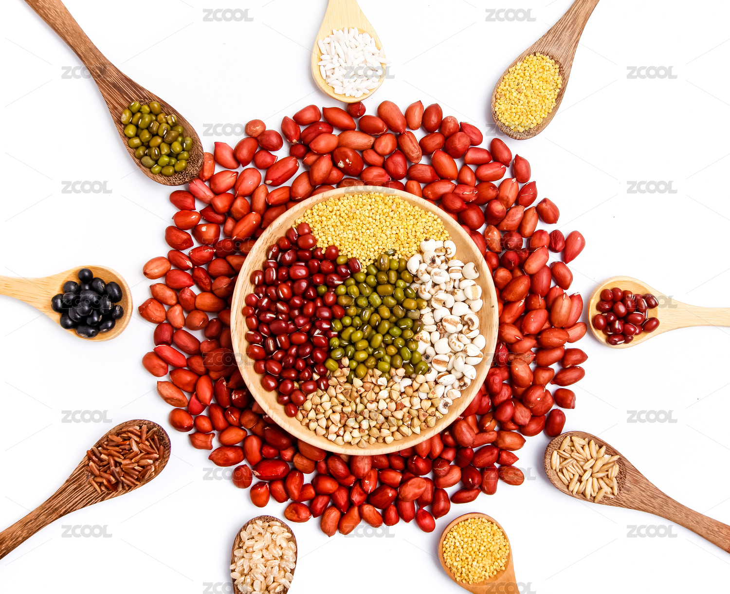 白底上装有五谷的勺子围成一圈中间放一堆花生