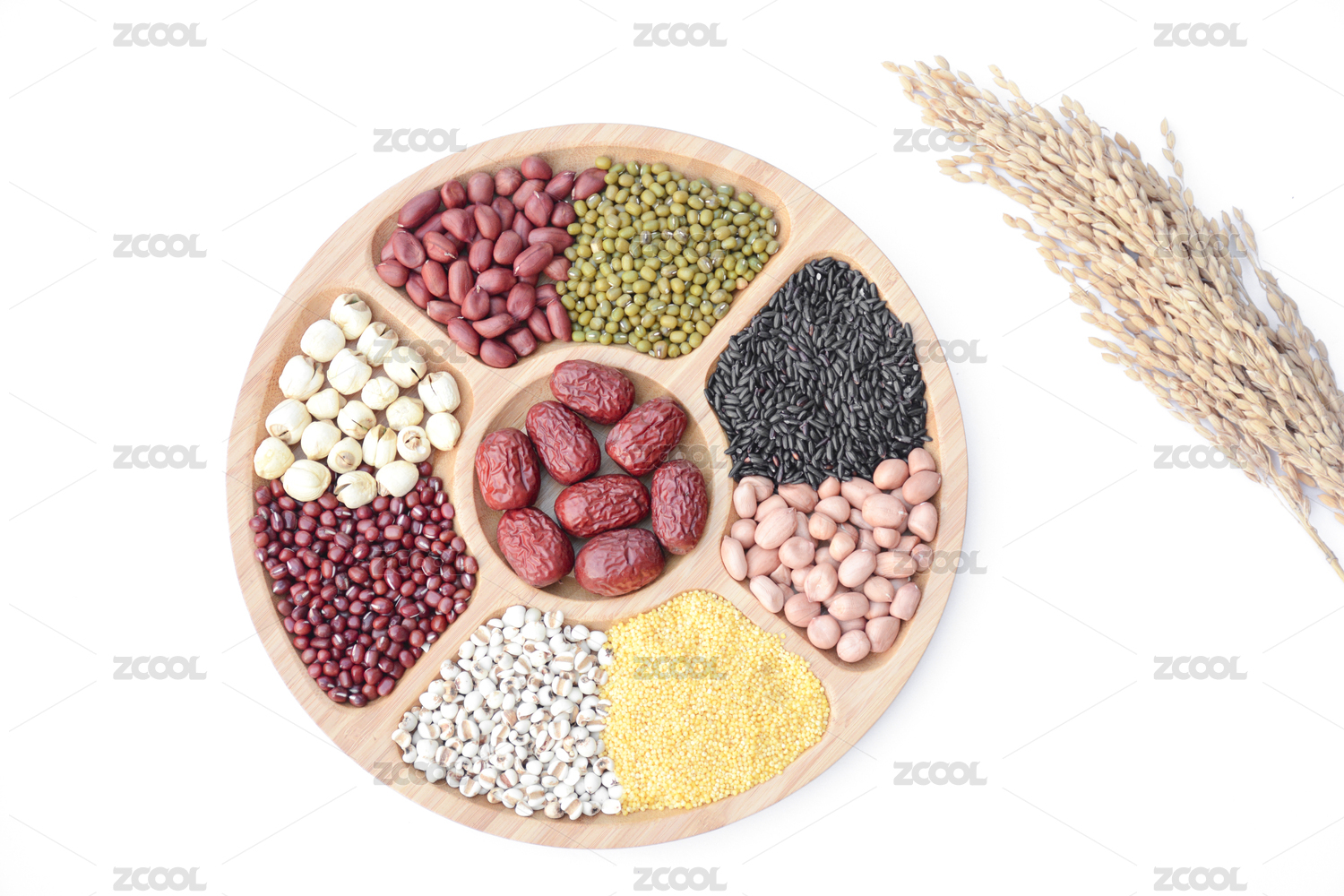 五谷杂粮在木质分格盘白底图