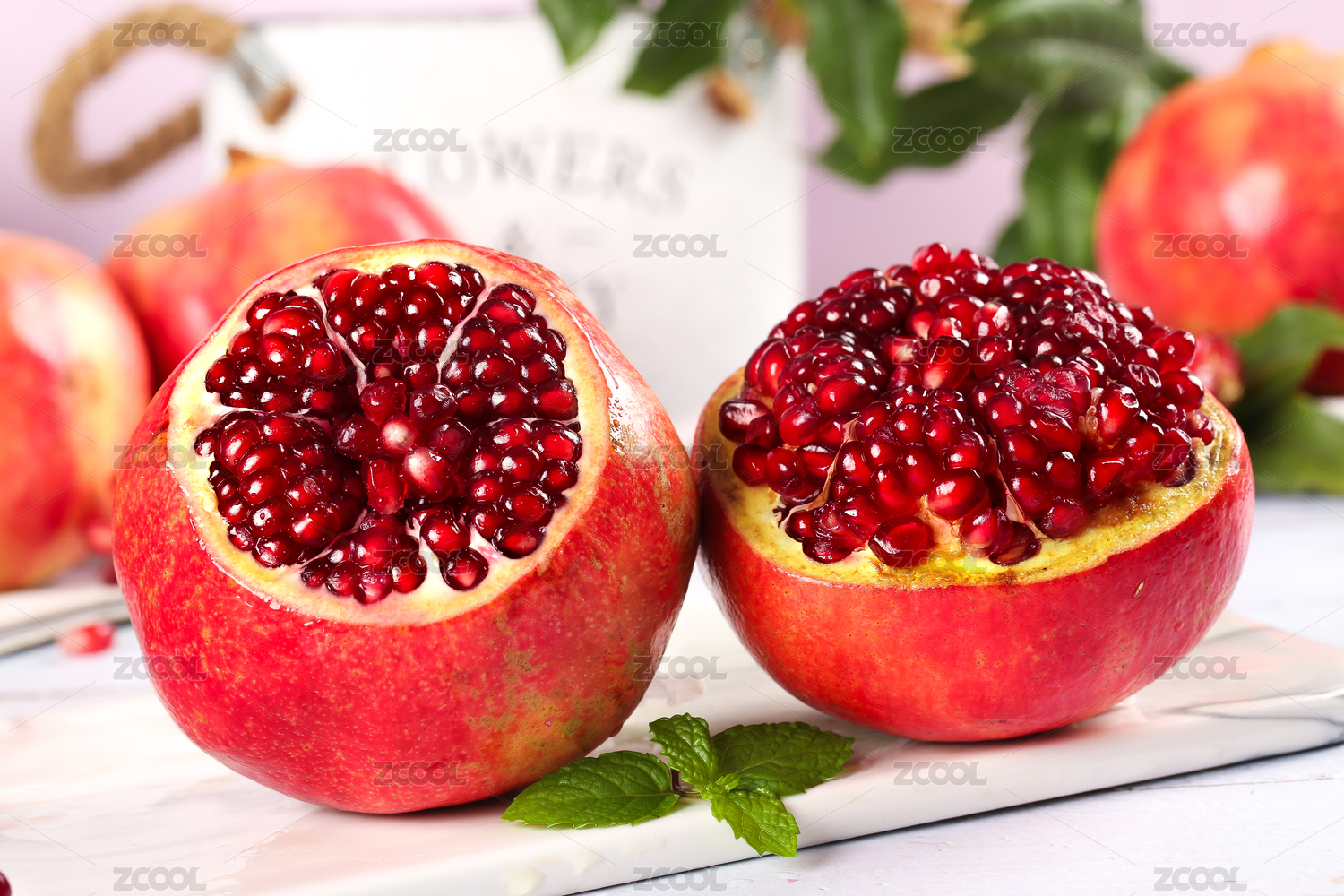 白底上石盘放着一个完整石榴和软籽石榴果肉