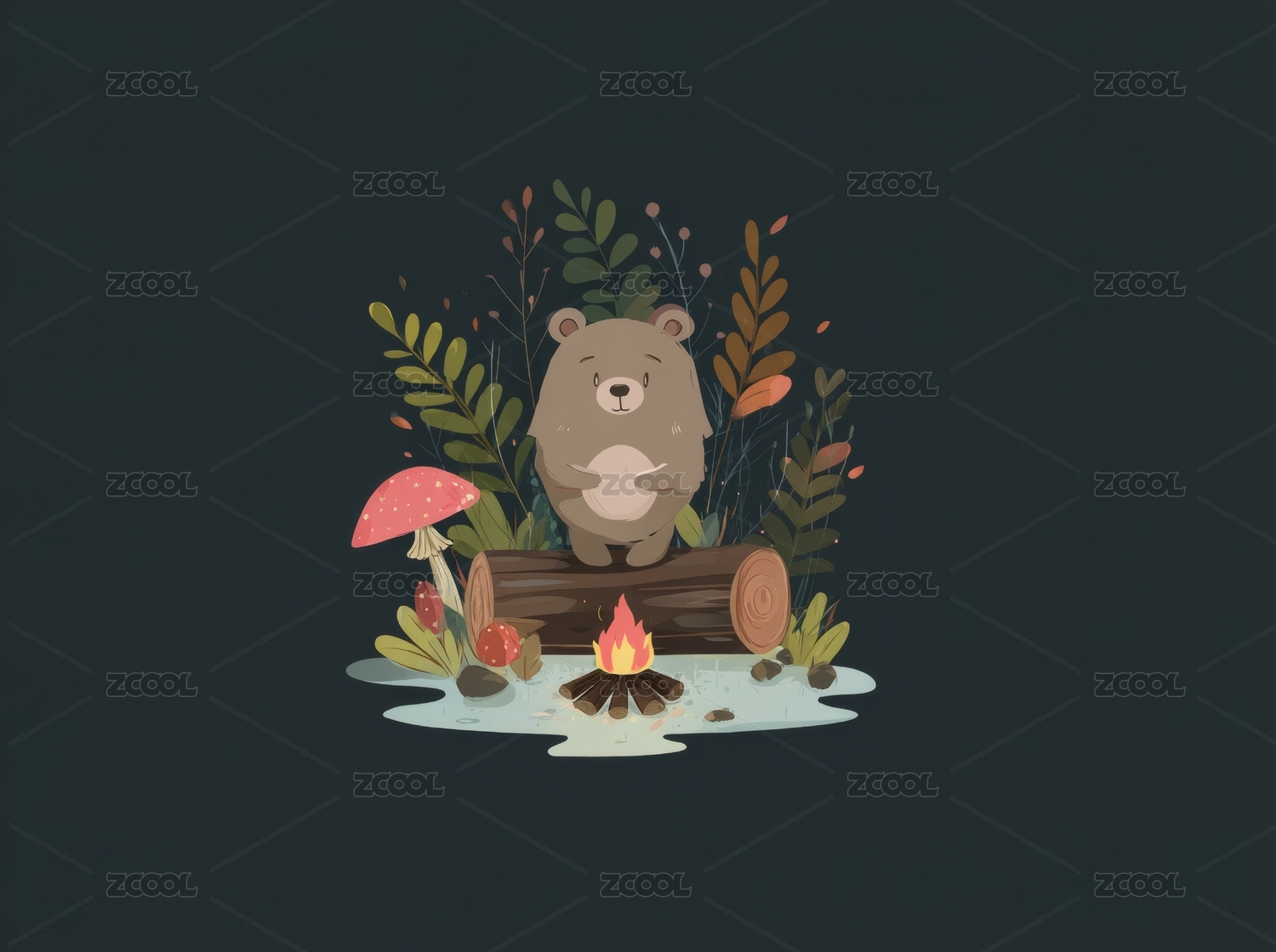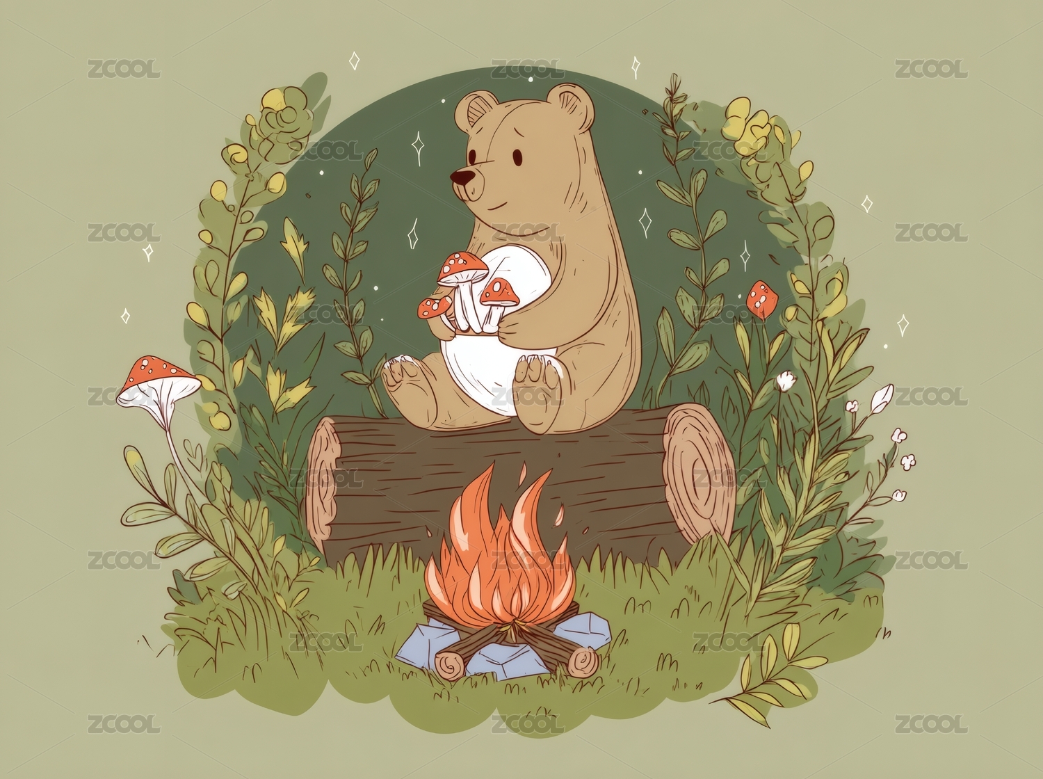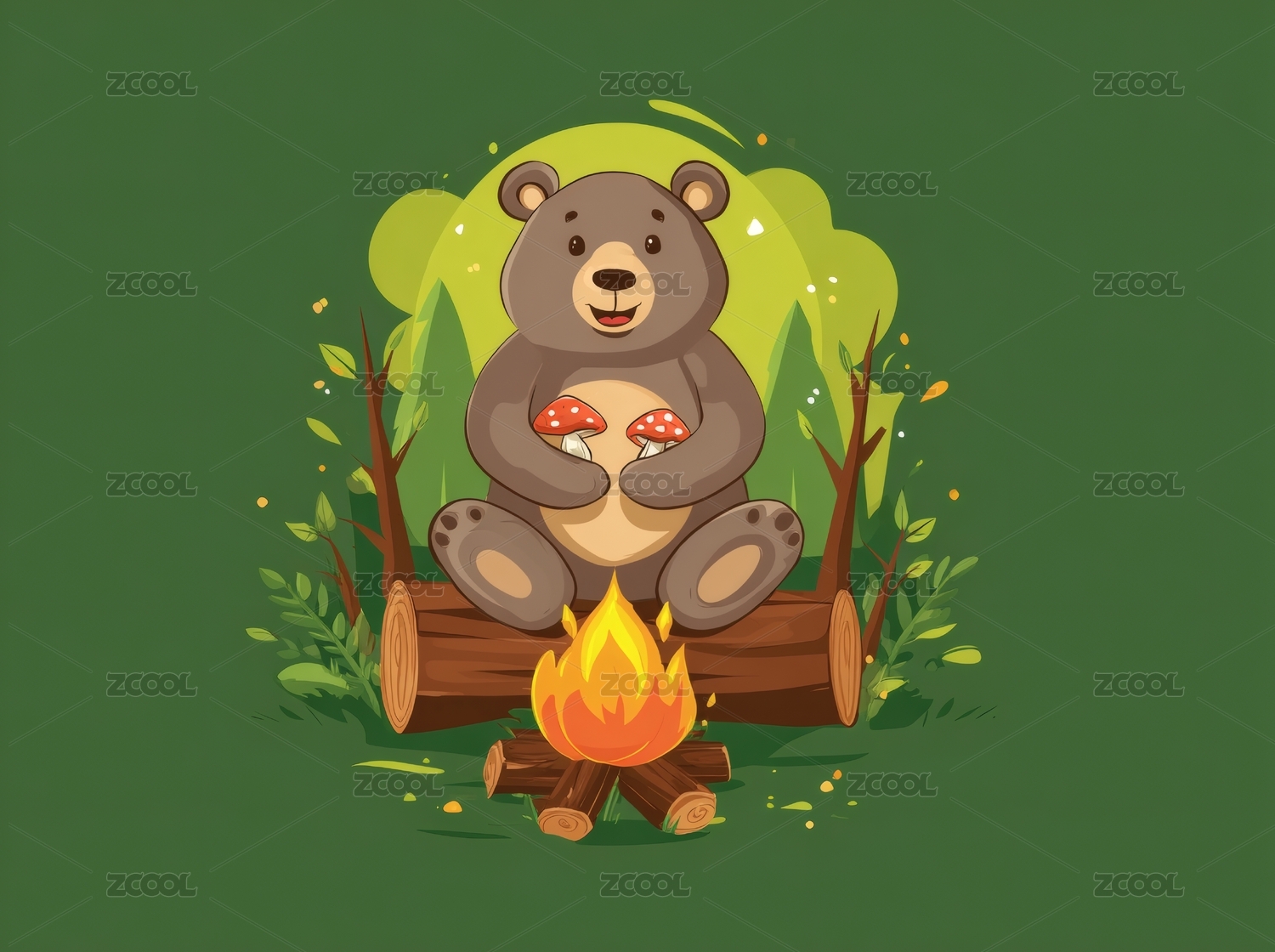 篝火,火堆,户外,丛林,熊,棕熊,背景,插画,插图,卡通
