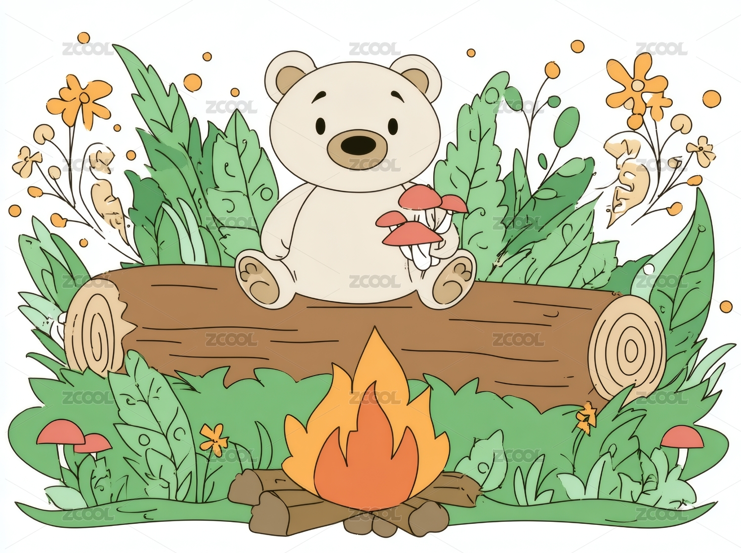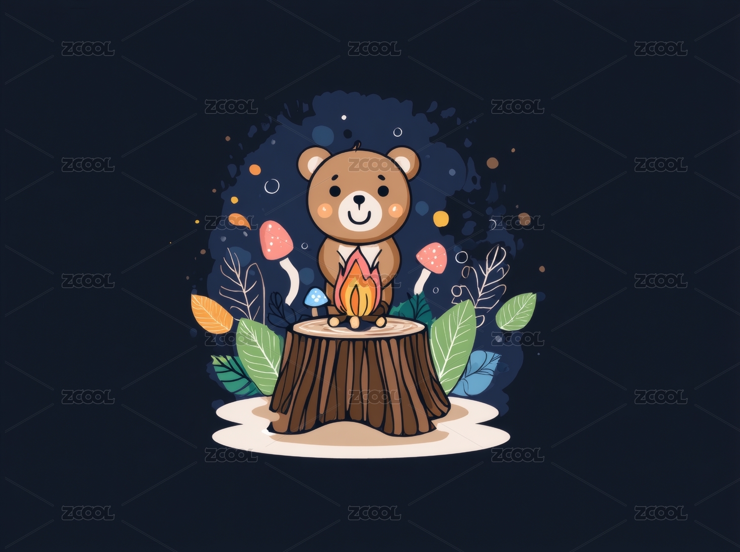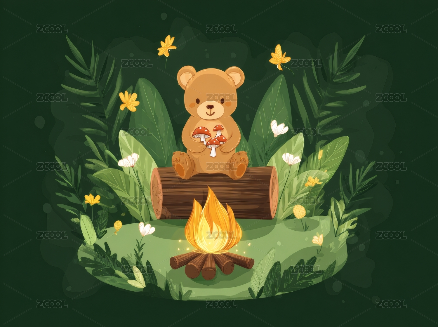 篝火,火堆,户外,丛林,熊,棕熊,背景,插画,插图,卡通