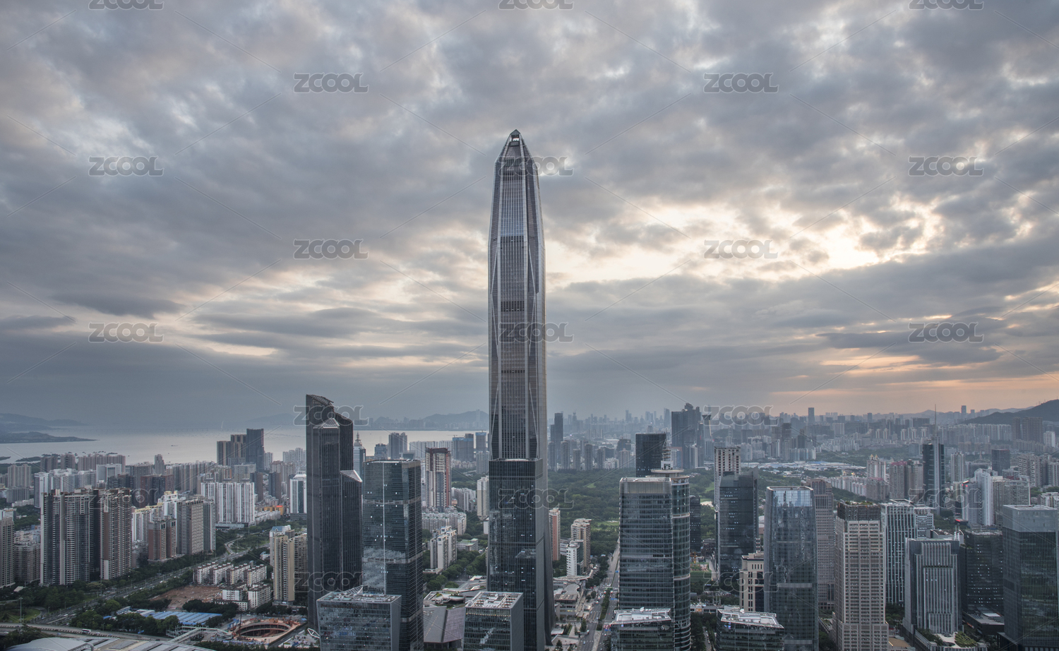 鸟瞰中国深圳平安大厦天际线建筑群傍晚风光
