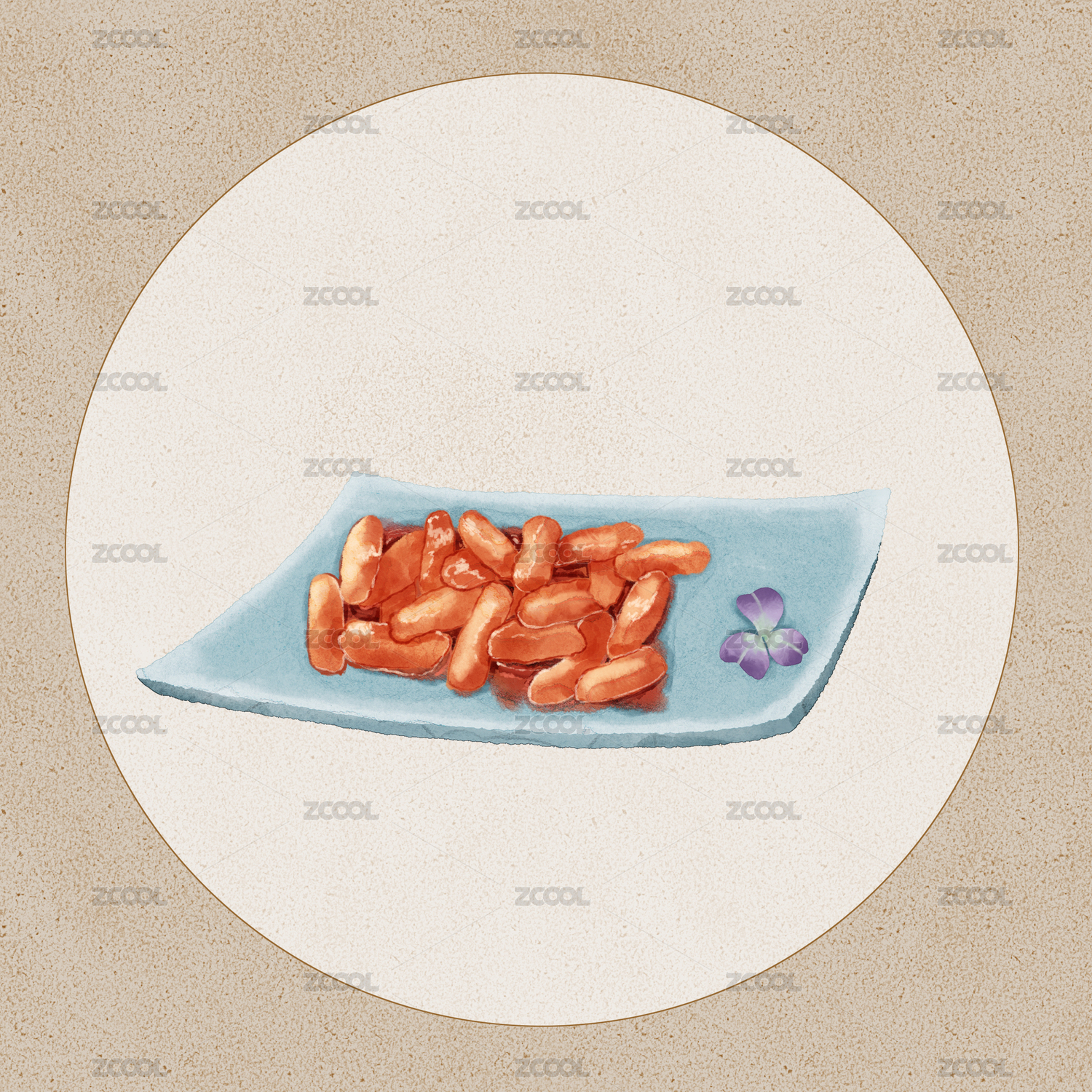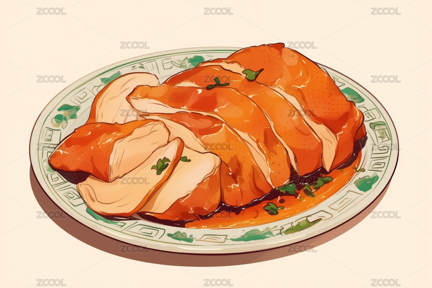 白底陶瓷盘中色泽鲜亮的传统美食烤鸭插画