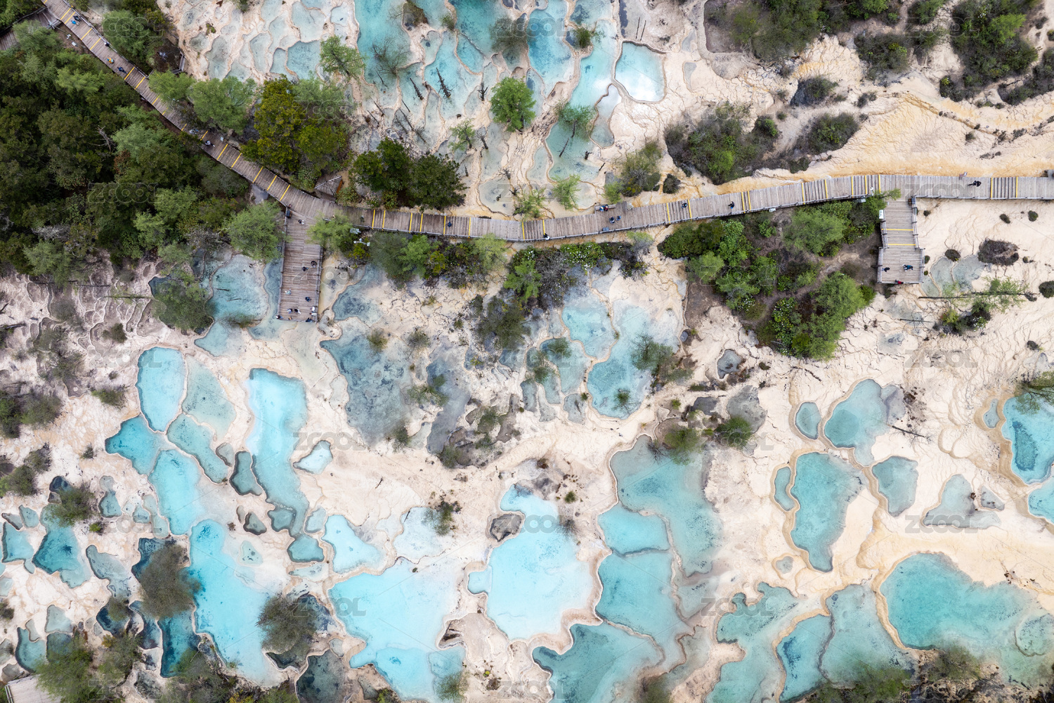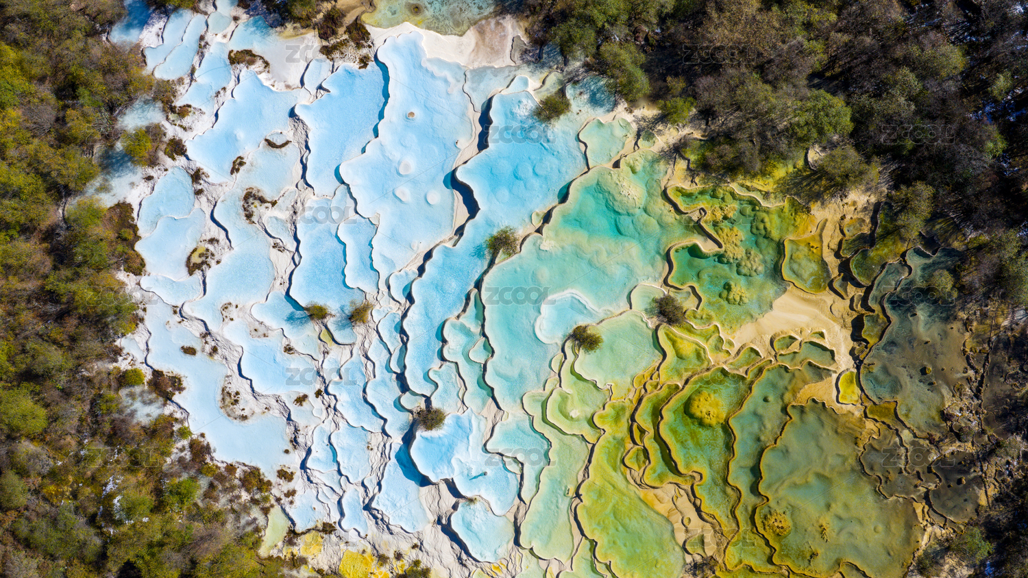 俯瞰九寨沟神仙池蓝色海子钙化池水中枯木
