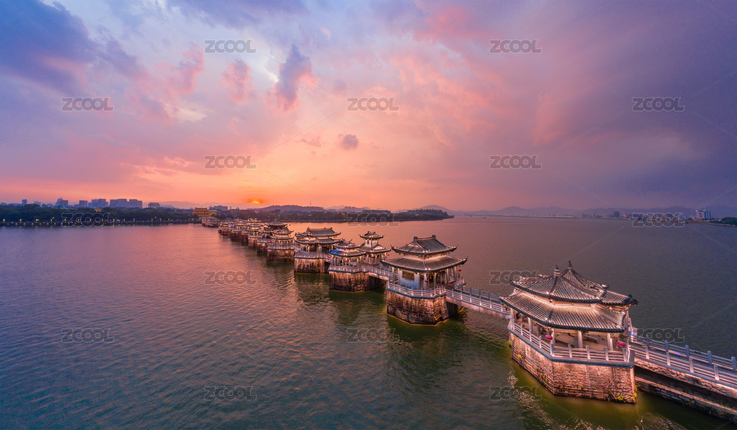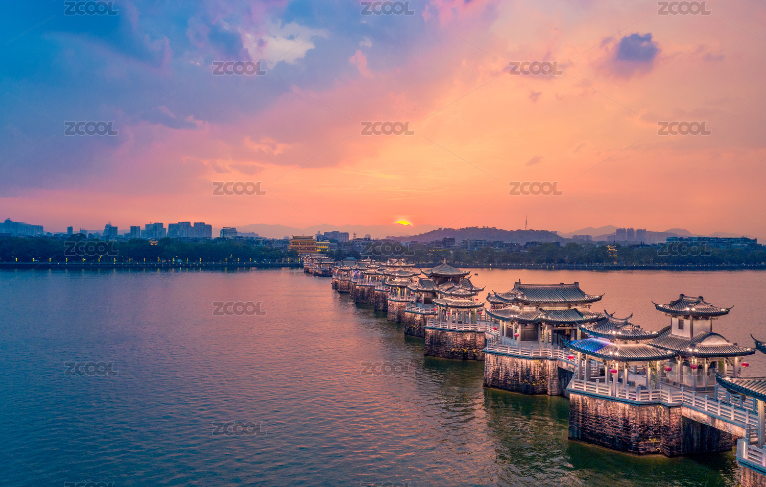 夏季壮美晚霞下的中国广东潮州广济桥航拍
