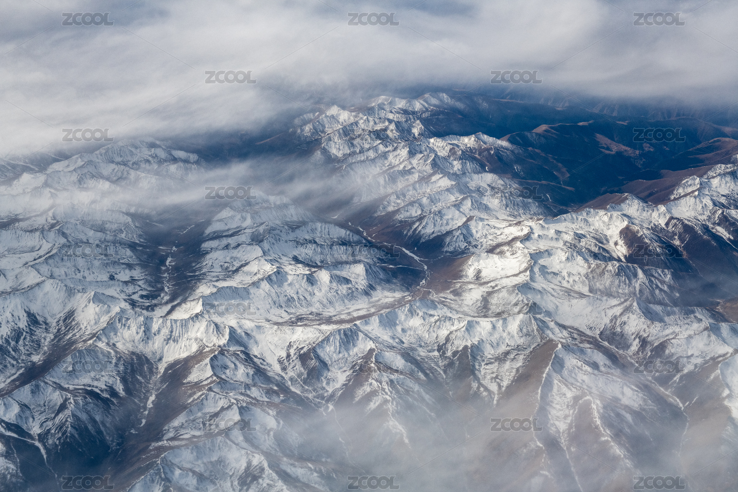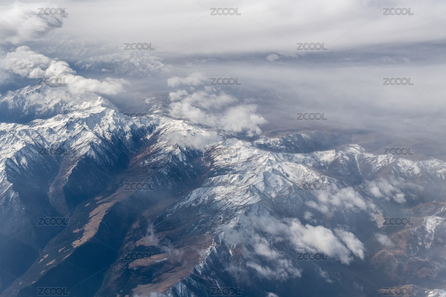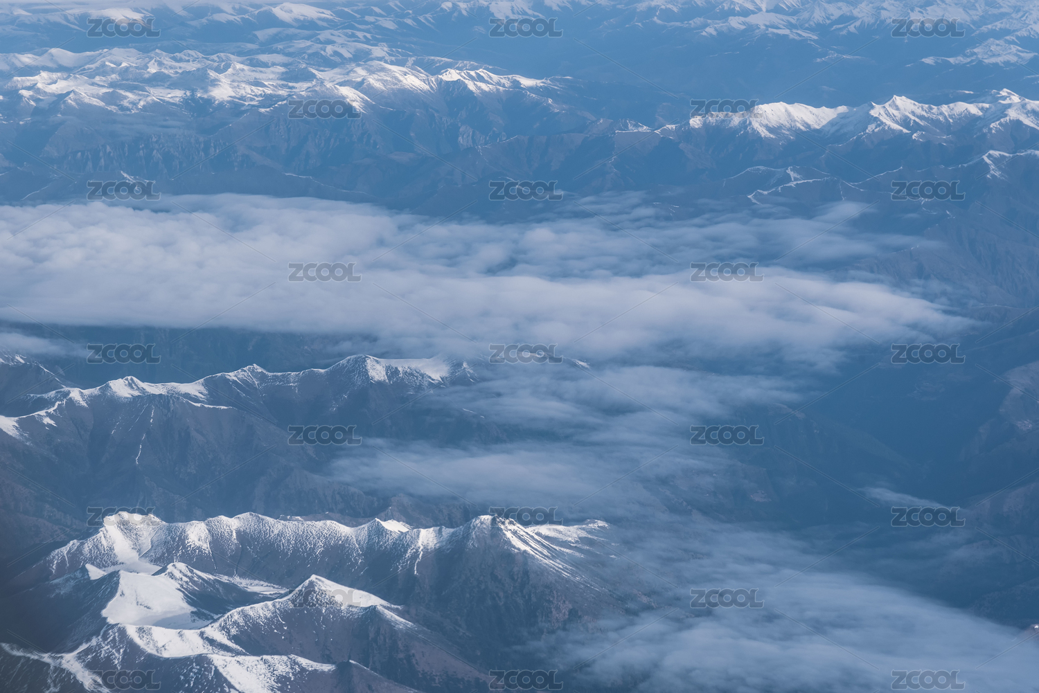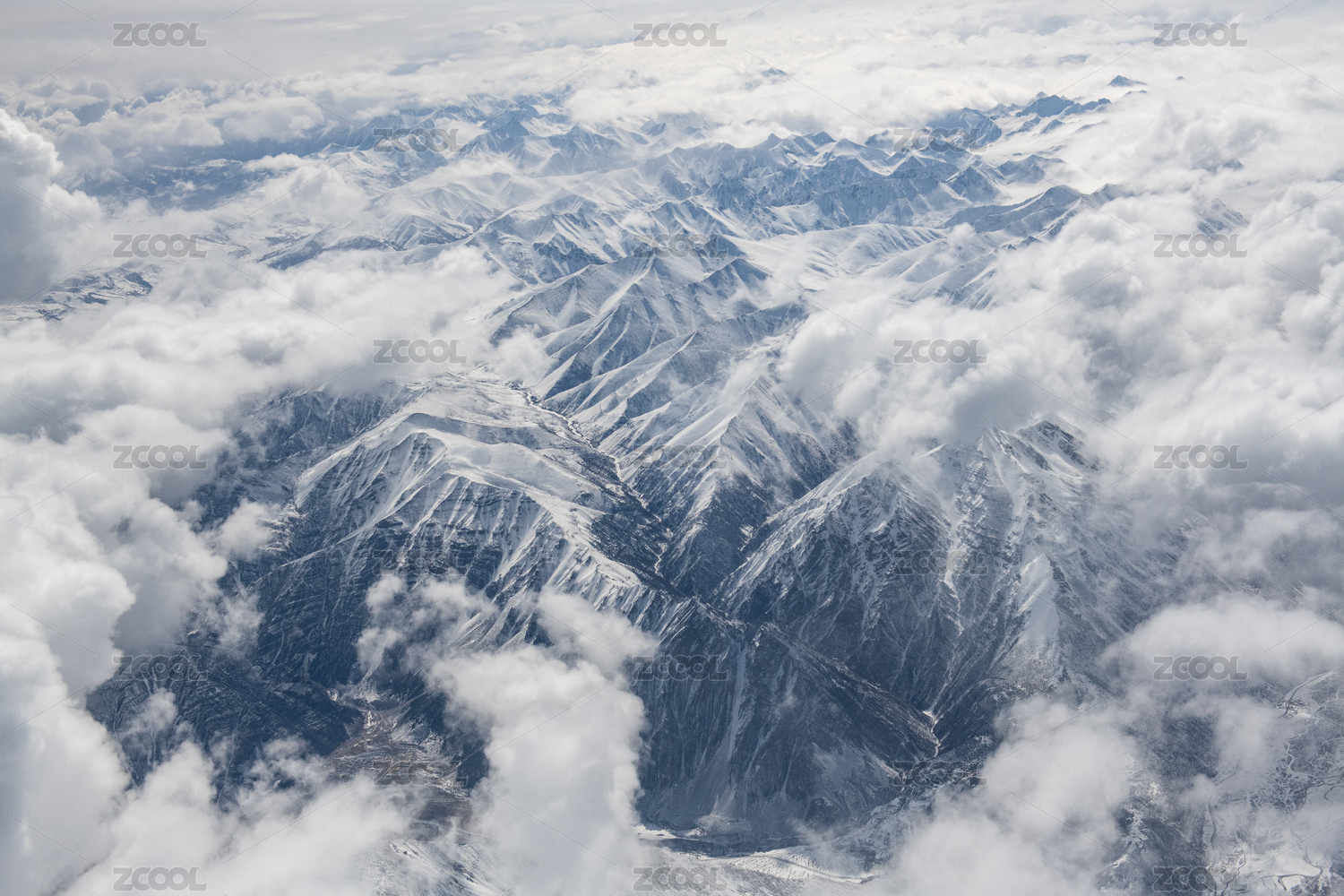 俯拍中国新疆地区云雾缭绕的雪山风景
