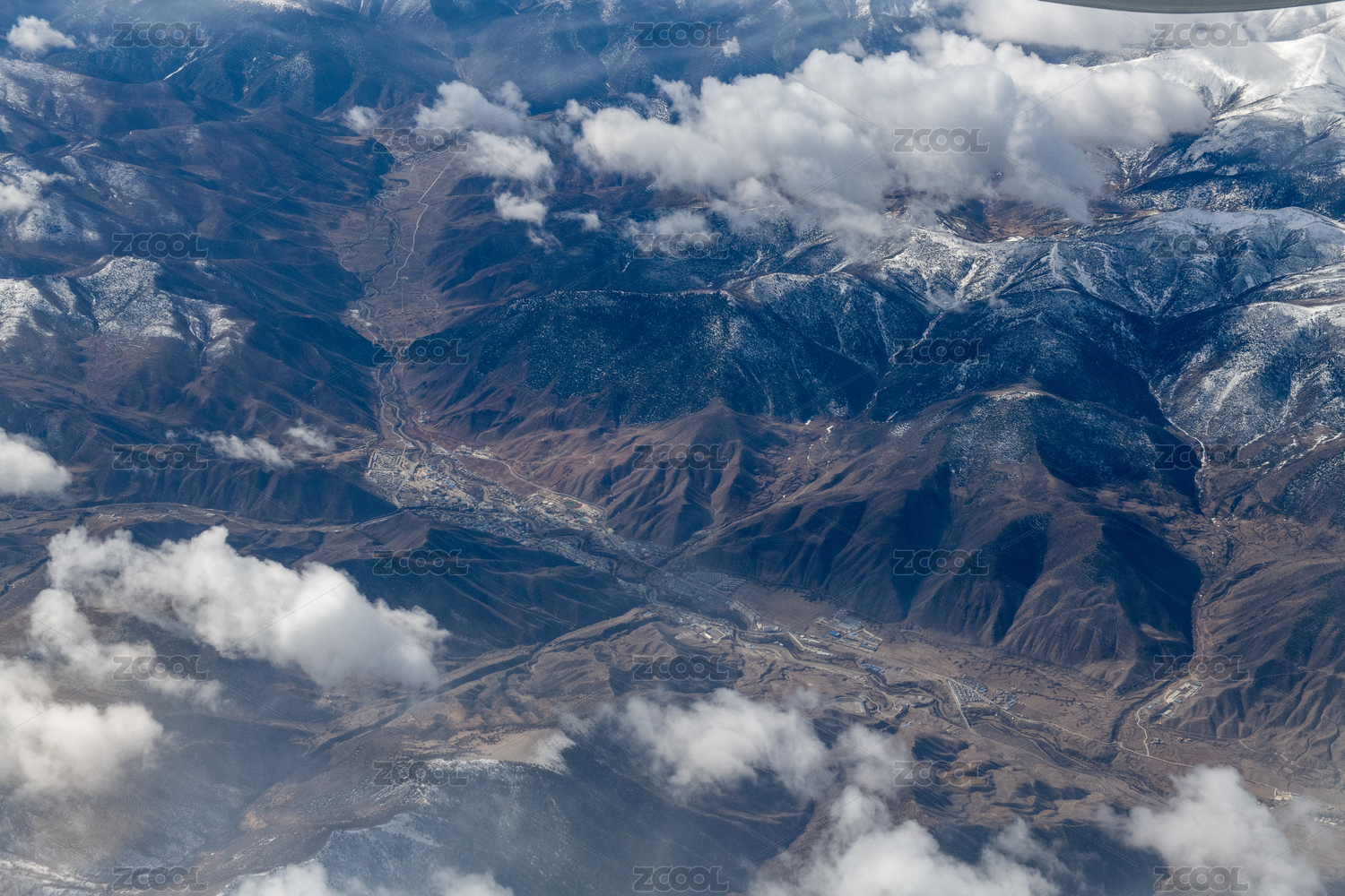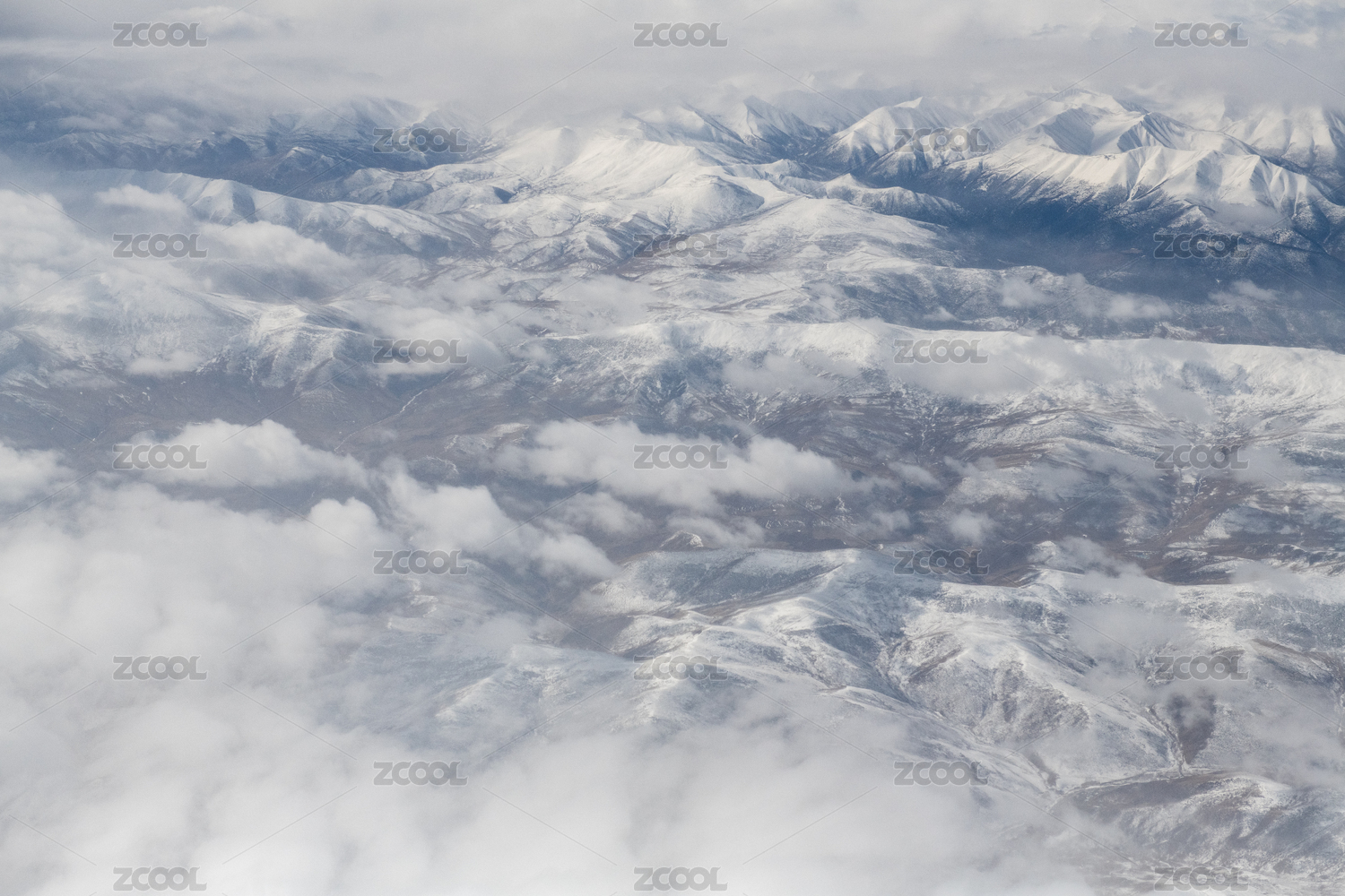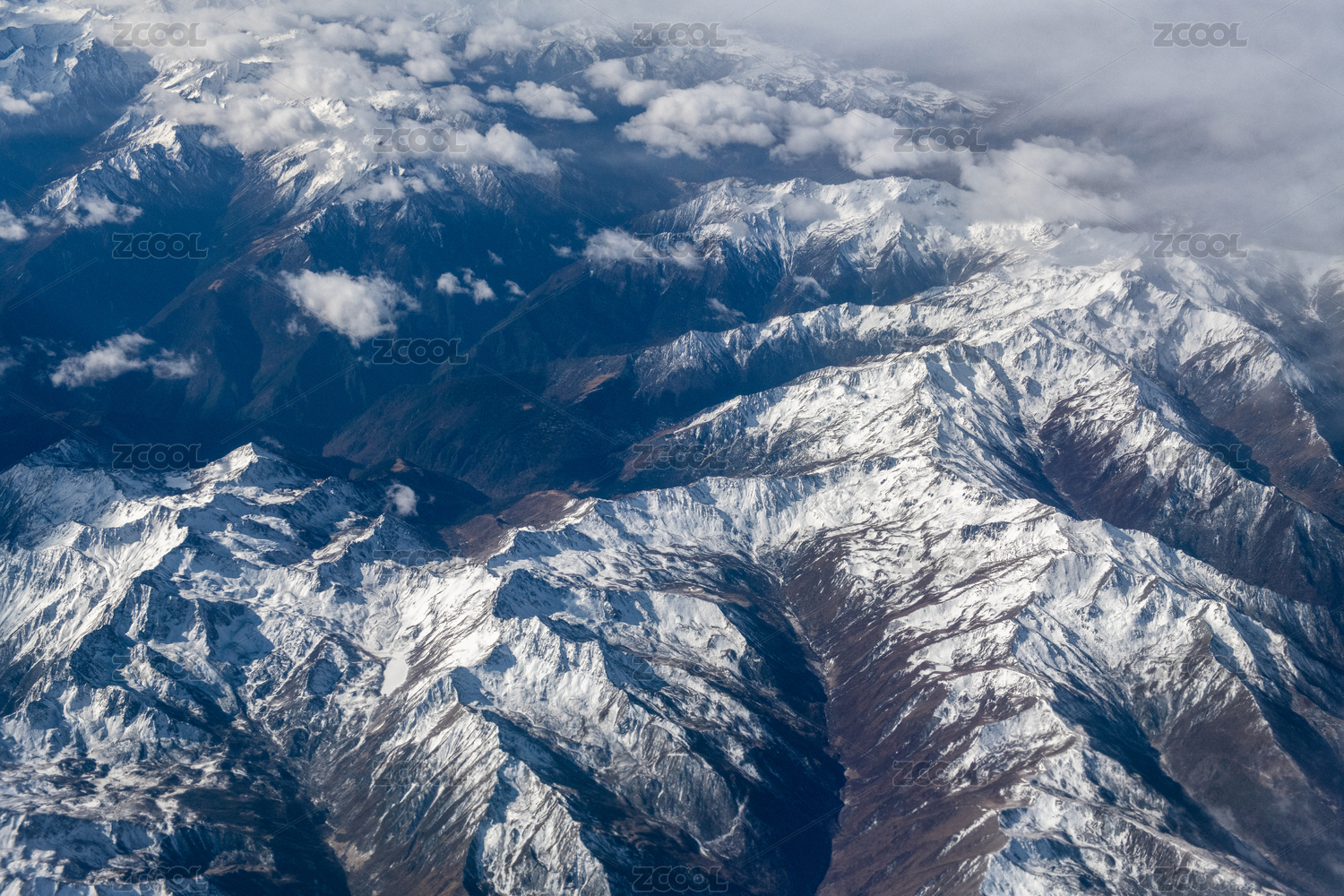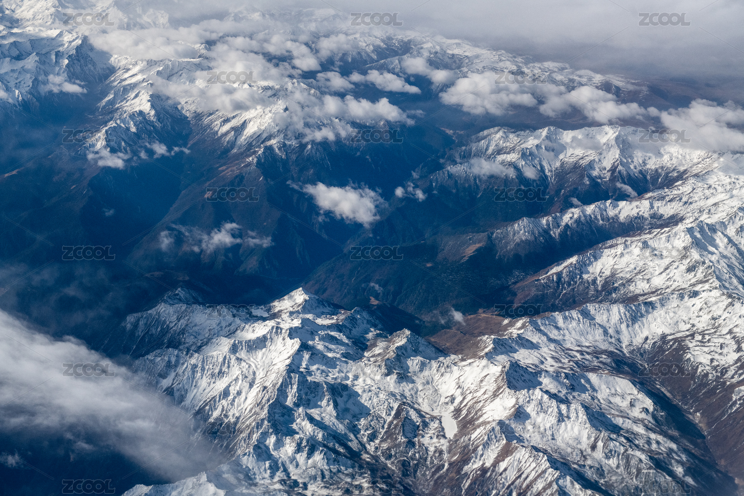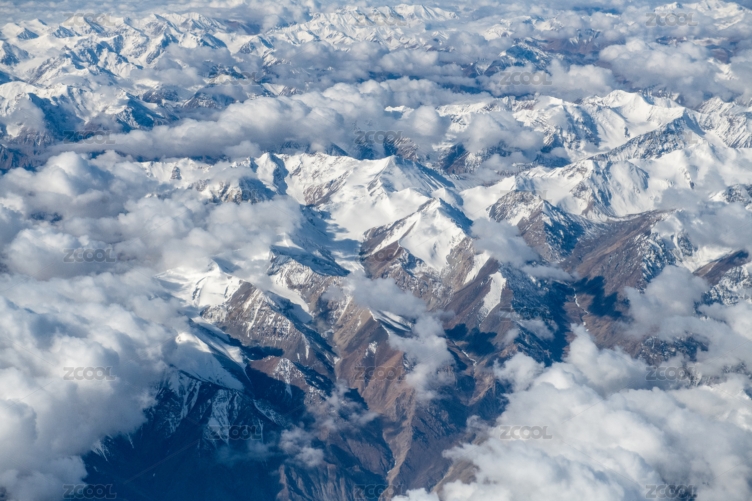 俯拍中国新疆地区云雾缭绕的雪山风景