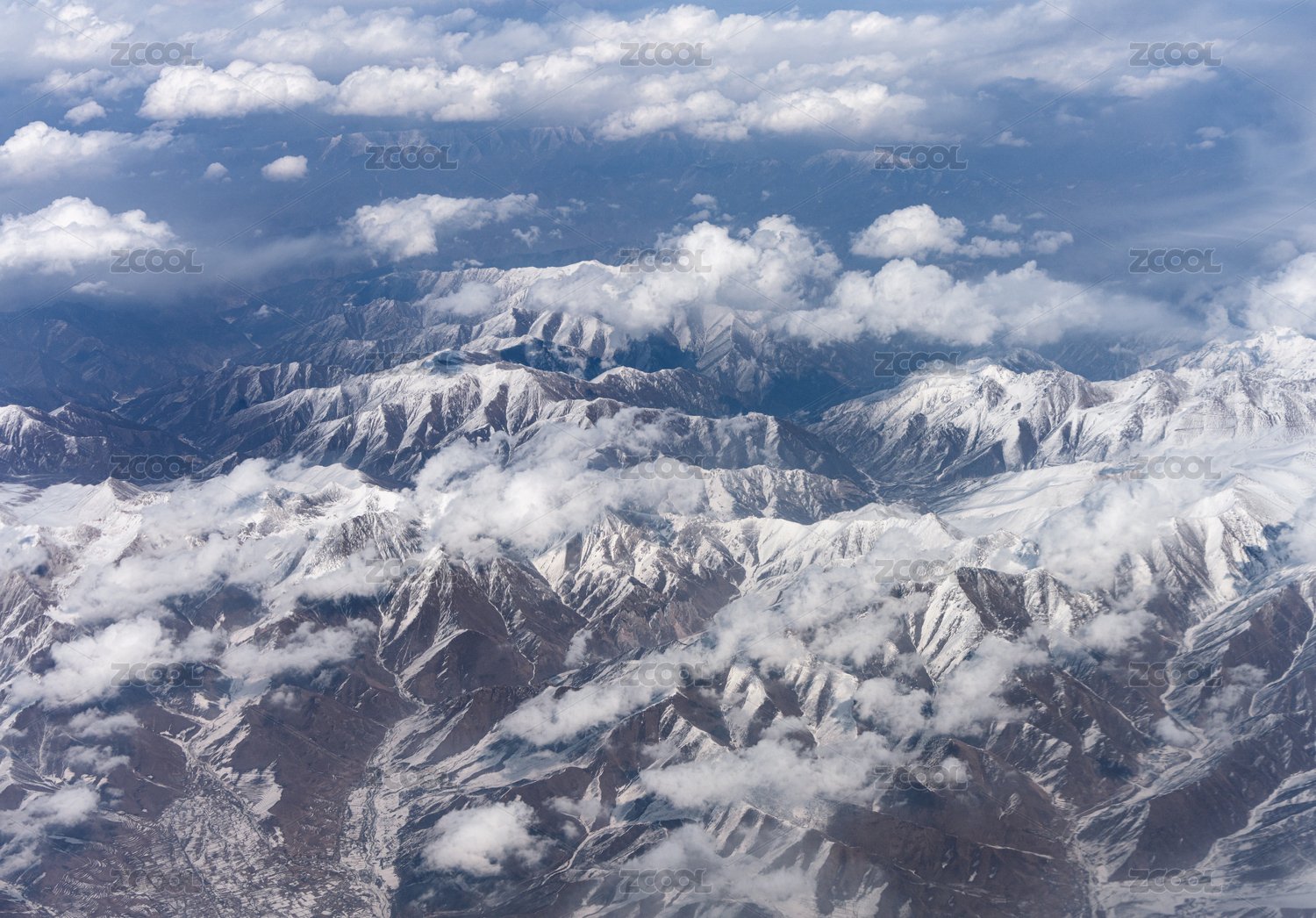 俯拍中国新疆喀什地区云雾缭绕的雪山风景