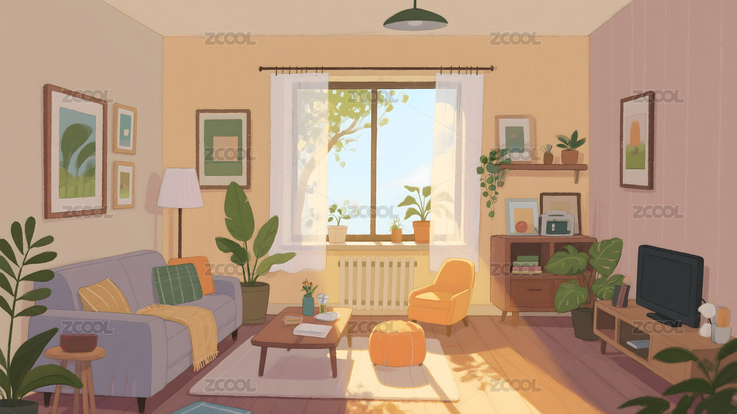 一个女生抱腿坐在地毯上望向远方思考旁边有琴叶榕和书,暖色调插画