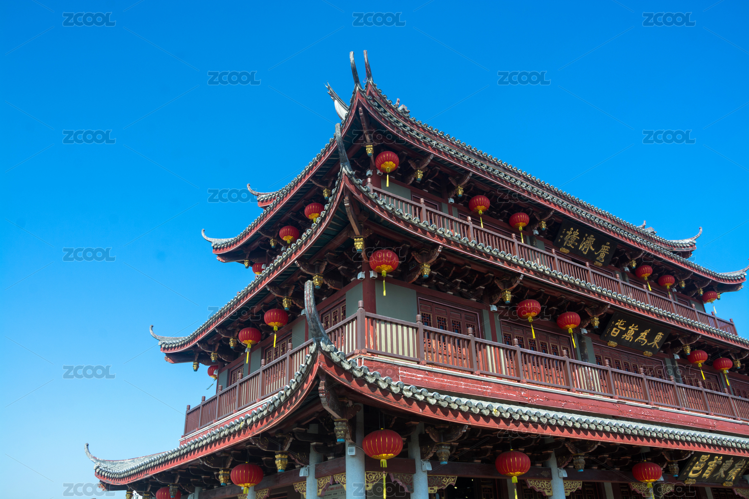 蓝天下的中式飞檐木结构建筑上悬挂的红灯笼
