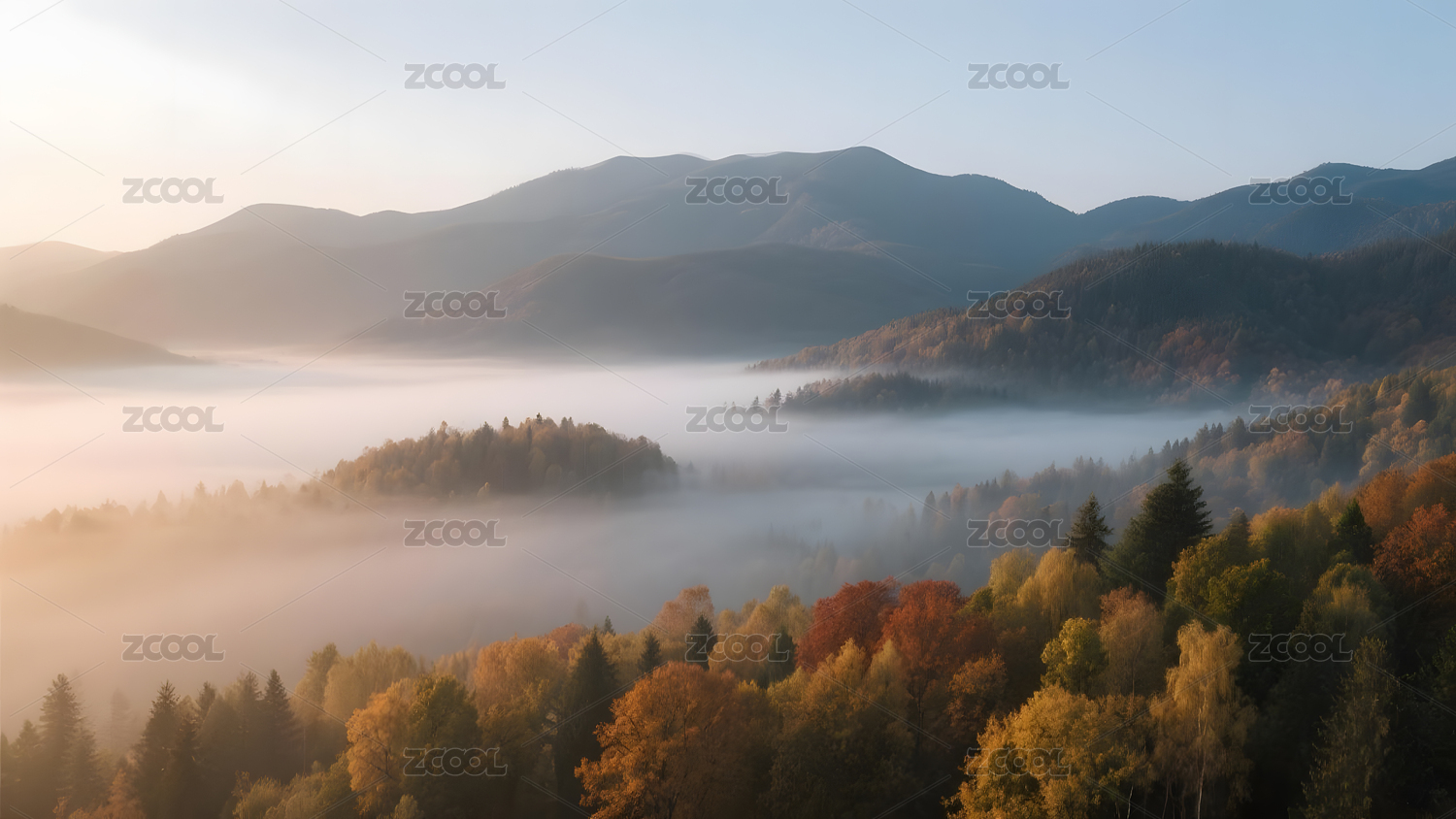 秋日湖畔晨雾静景