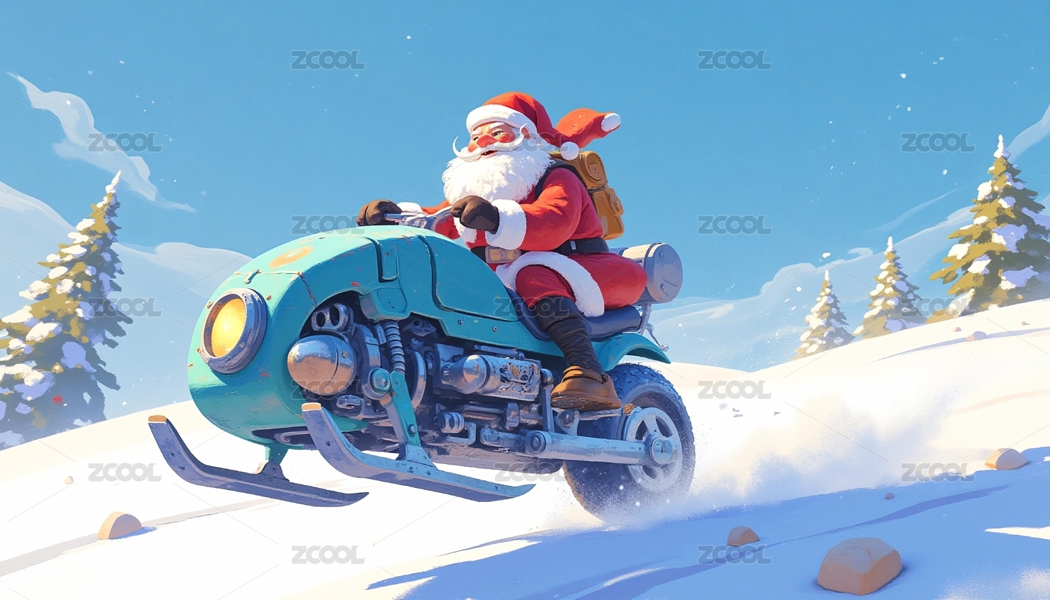 圣诞节,圣诞老人,驾驶,摩托车,雪地摩托,雪橇,飞驰,疾驰,腾空,背包