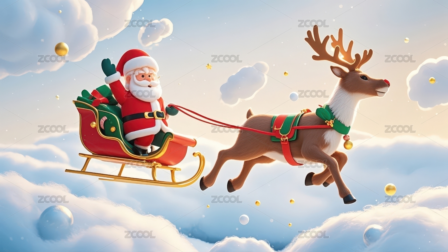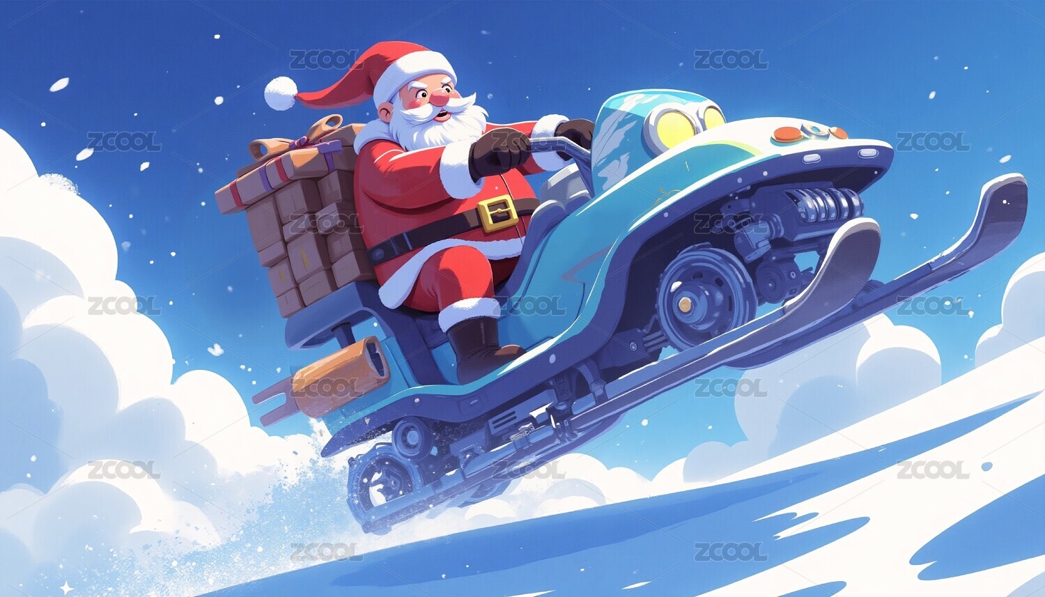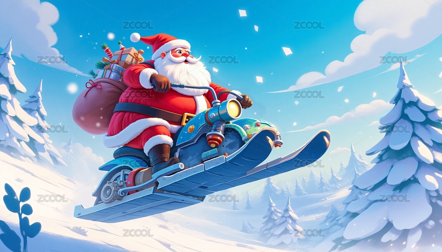圣诞老人驾驶雪地摩托车飞跃雪地