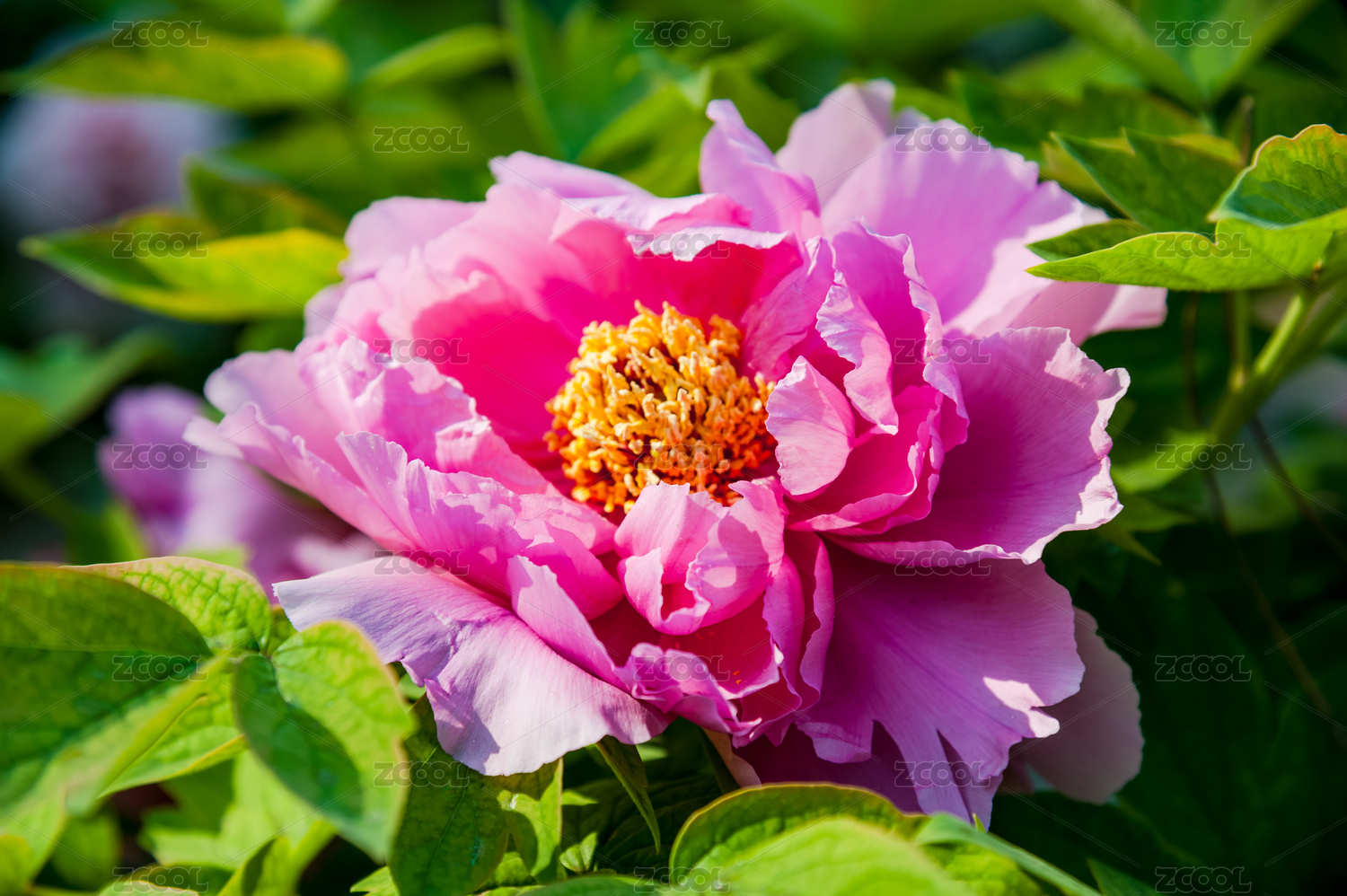 春天早晨阳光下盛开国色天香牡丹花篱笆