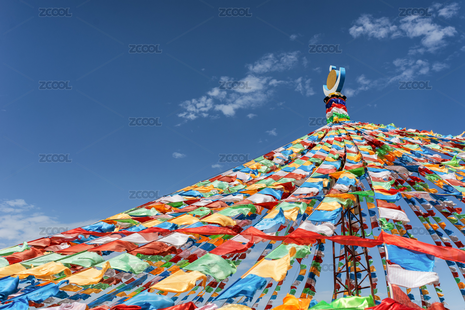 蓝天下茶卡盐湖的经幡迎风飘扬