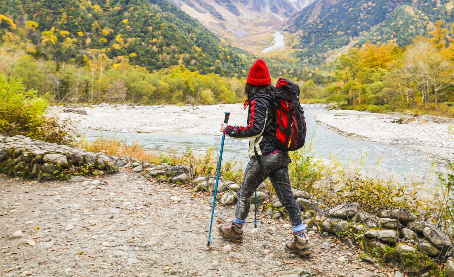 在日本阿尔卑斯山上高地徒步登山旅行的女人
