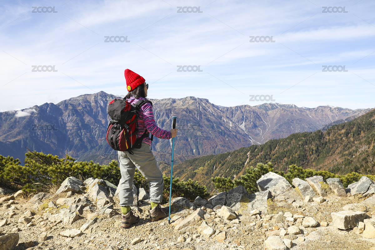 在日本阿尔卑斯山山顶欣赏风景的徒步旅行者