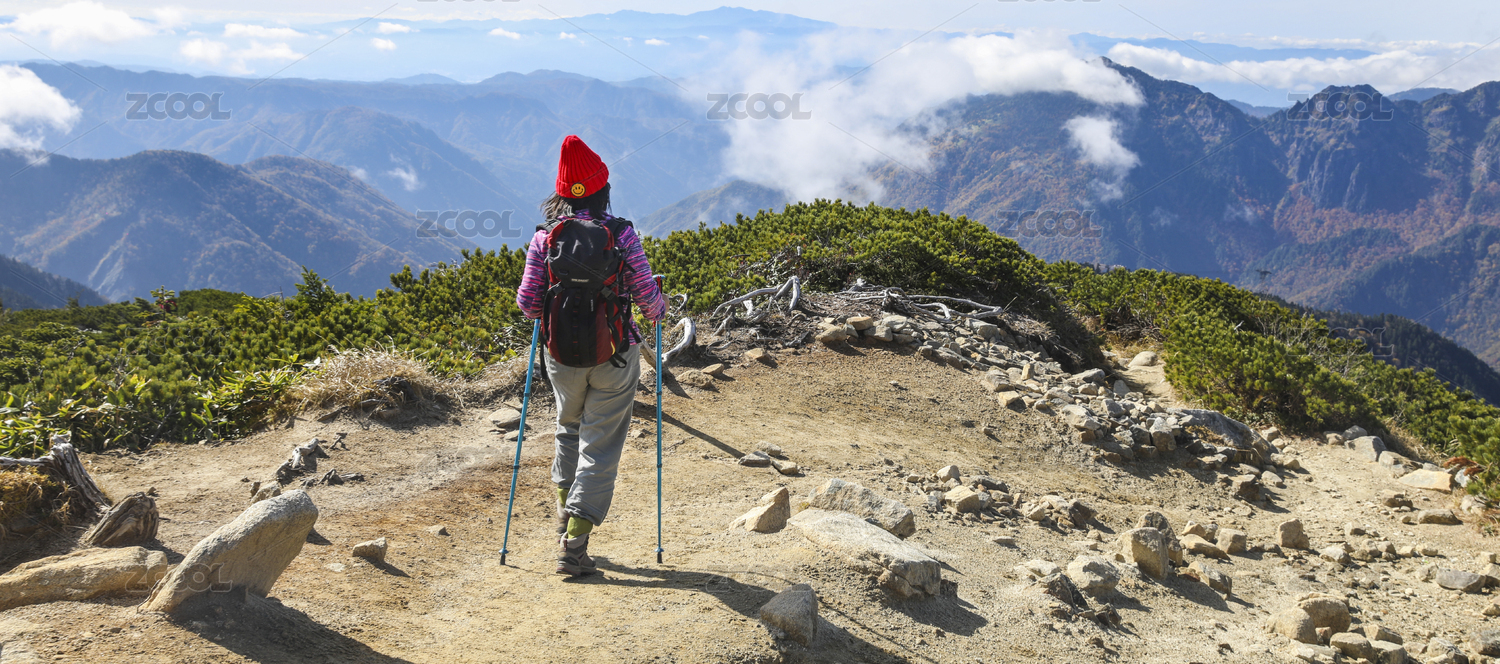 一个手拿登山杖站在山顶看着远方的女性徒步旅行者背影