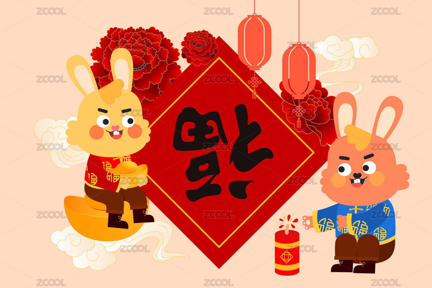 两只老虎提着灯笼和布老虎在福字前奔跑