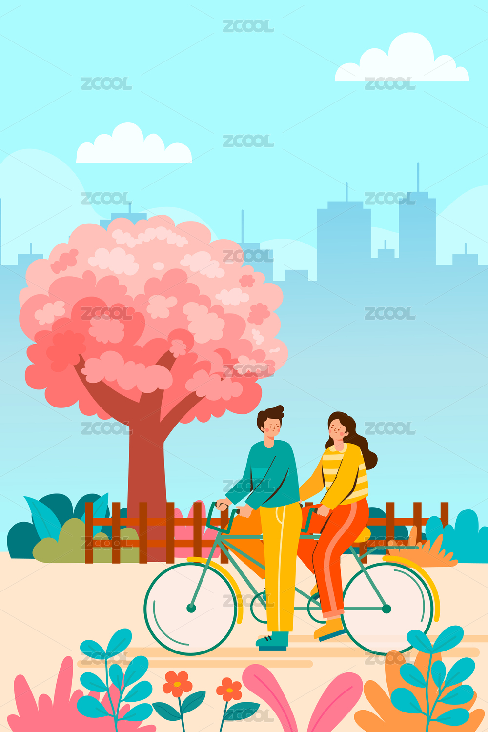 卡通立春出行踏青情侣骑自行车背景矢量插画