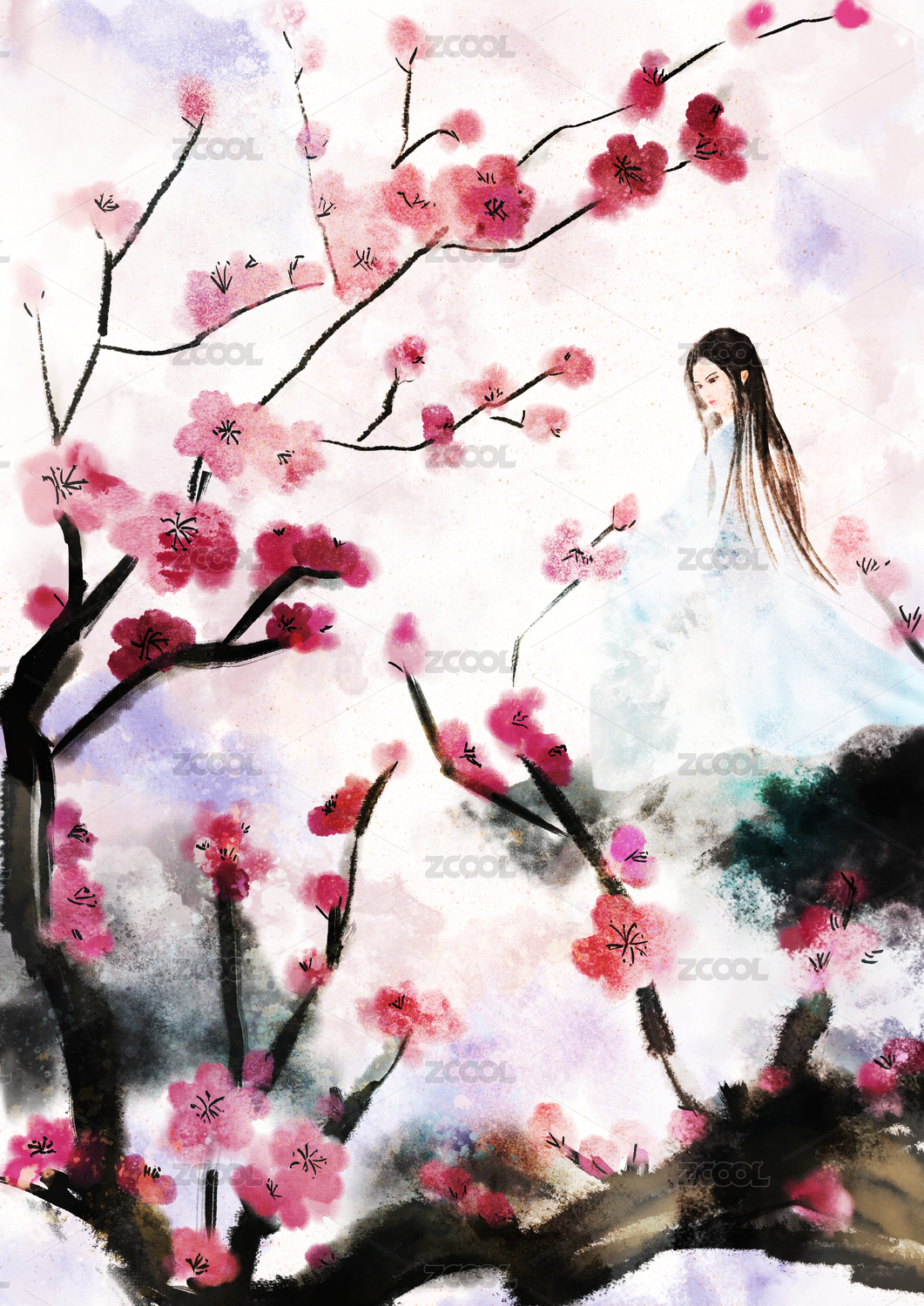 女子,红梅,水墨画,写意画,中国画,美人,东方意境,淡雅,优雅,意境