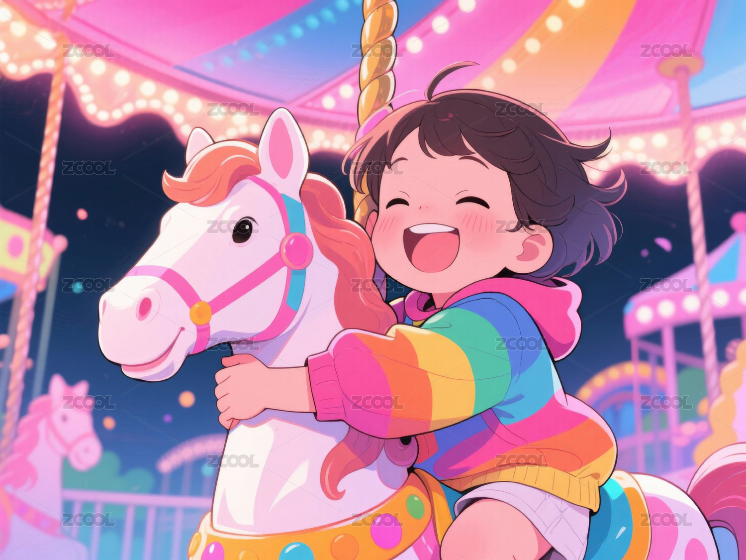 在梦幻空间开心的骑摇摇马的可爱姑娘