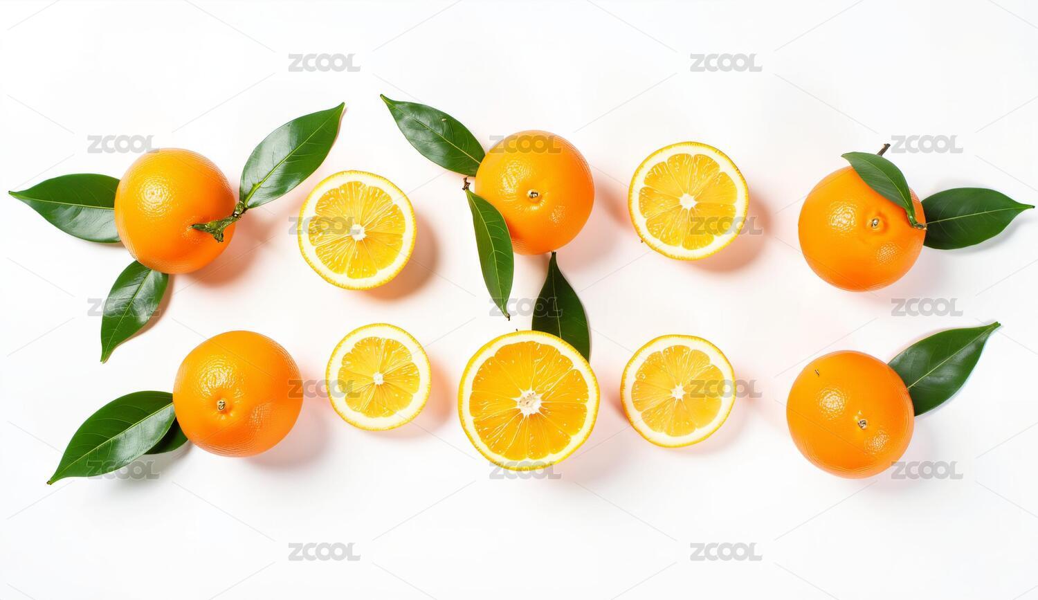 新鲜的橙子和绿色的叶子在白色背景上,俯拍镜头