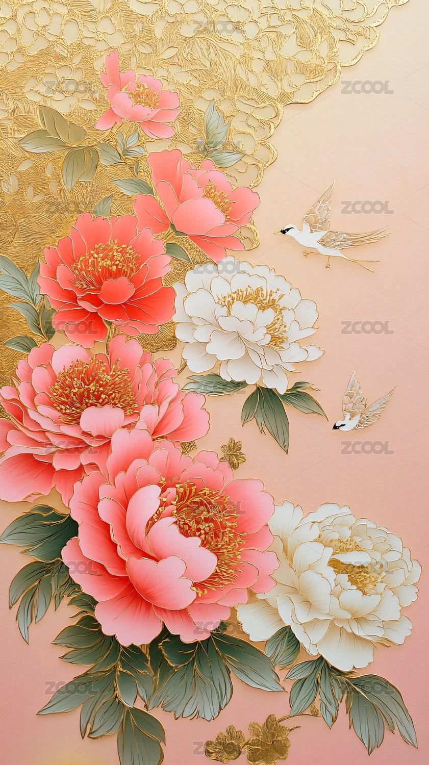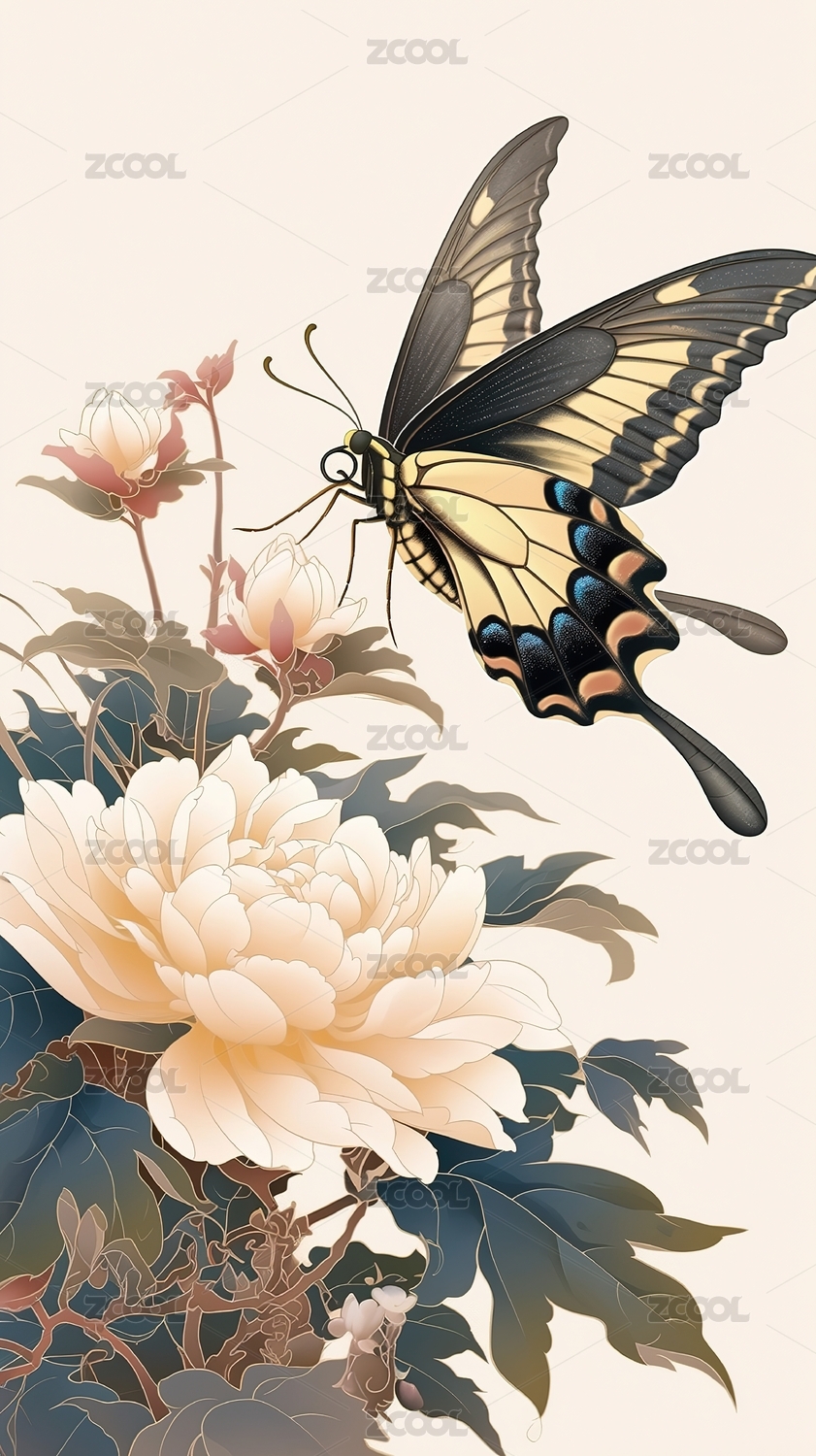 AIGCFG,国潮,牡丹花,植物,枝叶,国风,复古,中式,中国风,蝴蝶