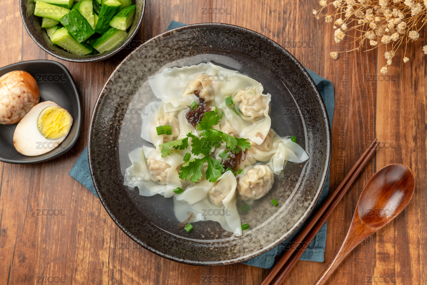 一碗馄饨摆放在木桌面上旁边放有卤蛋拌黄瓜